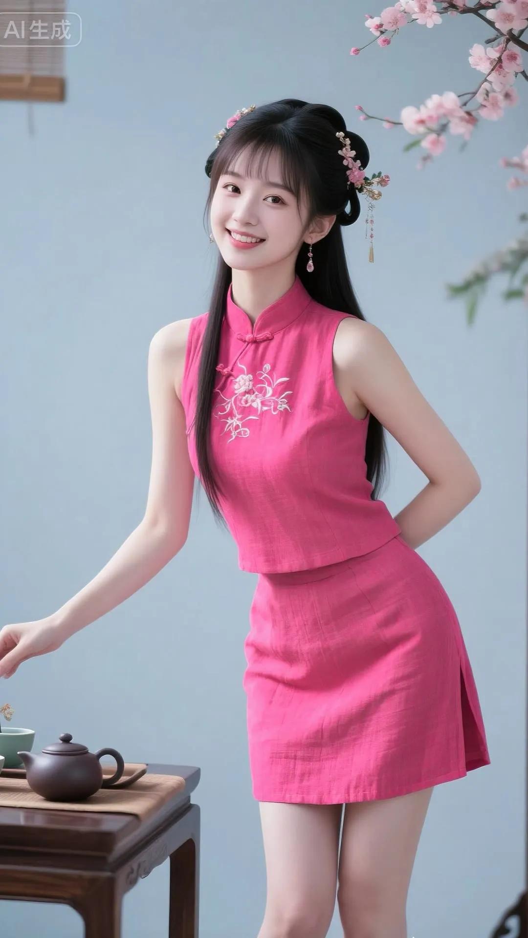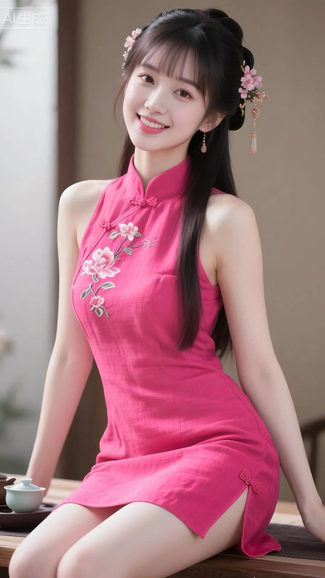 粉嫩少女风,古风刺绣旗袍,优雅动人