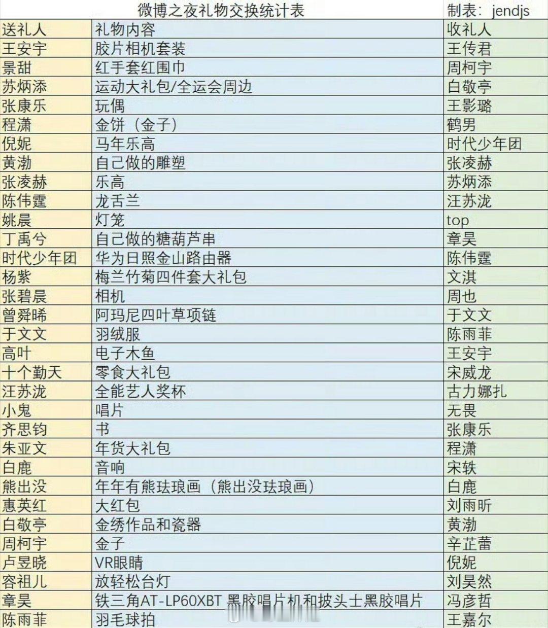 微博之夜的礼物交换统计表来了,如果可以让你任意去选择一个的话,你最想收到谁送过来的礼物呢?