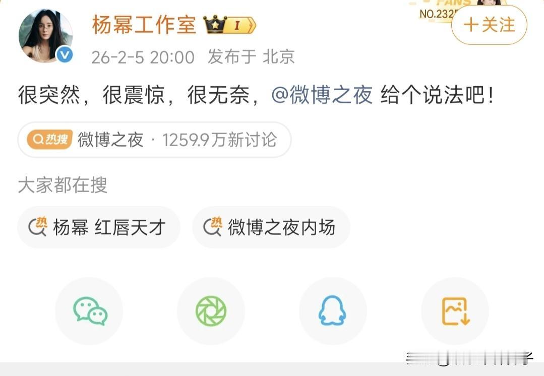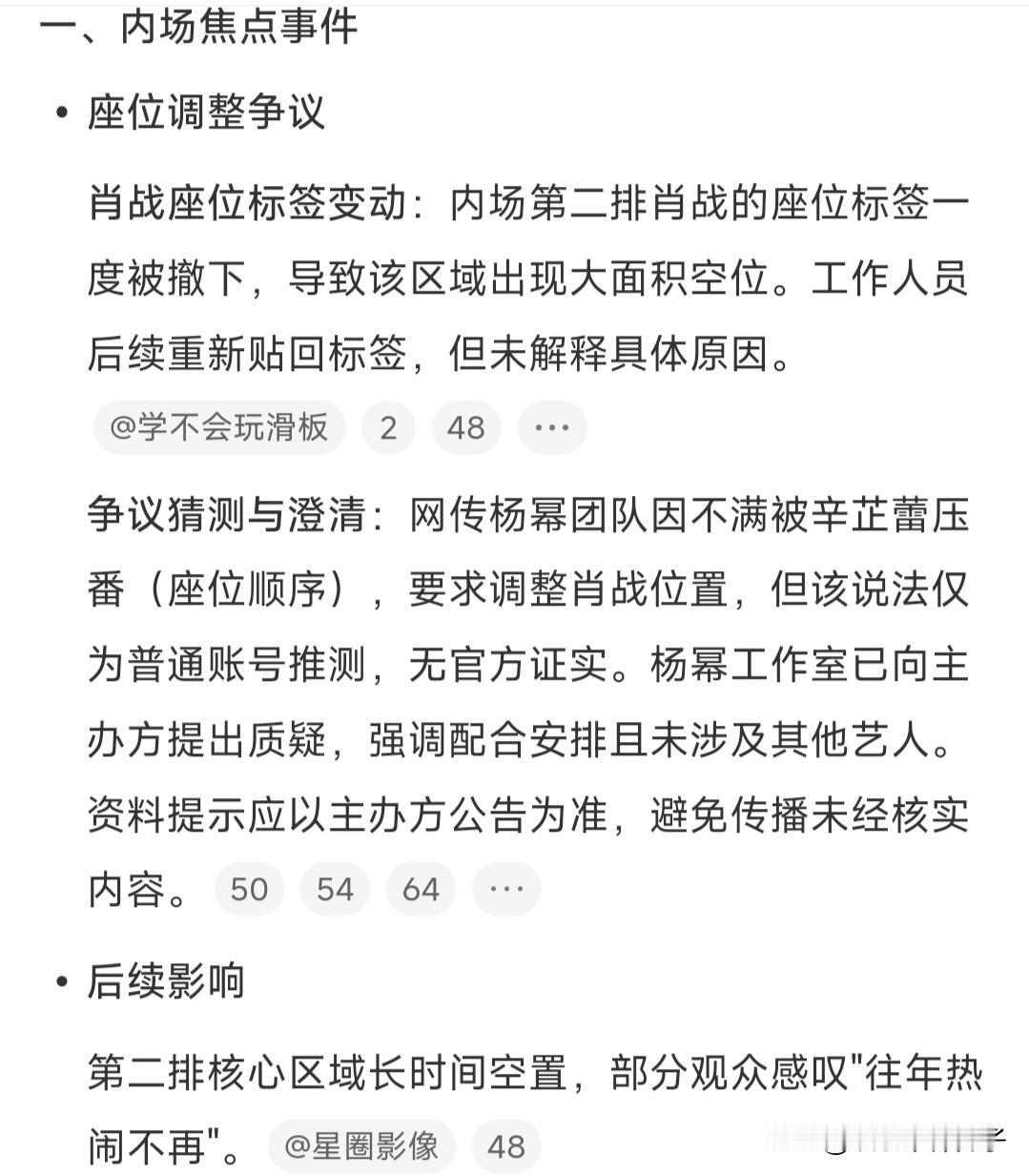 曝微博之夜明星抢C位,杨幂工作室发文讨说法! 2月5日,微博之夜红毯,众多明星纷纷到场,打扮的非常漂亮,给观众带来一场视觉盛宴。 不仅如此,内场也非常精彩,然而,却出现一点小插曲。 网友爆料,有明星为了抢C位,把肖战座位上的标签撕掉了,由于安排混乱,造成第二排的人陆续离场,几乎空了,后续,有工作人员又把标签贴回来了。 随后,杨幂工作室发文:很突然、很震惊、很无奈,并喊话微博之夜,要求给个说法。 咱就说,原本出席活动,还能遇到好友,畅聊一番,没想到,遇到这样的烦心事,也难怪工作室不乐意了。 另外,网上晒出微博之夜内场座位分布图,显示:肖战、辛芷蕾、杨幂和杨紫四个人挨着。 网上晒出的视频,几位明星的位置,也跟座位图一致,似乎没有问题。 到底什么情况?不得而知,或许其中有什么误会,还是希望大家理性吃瓜。
