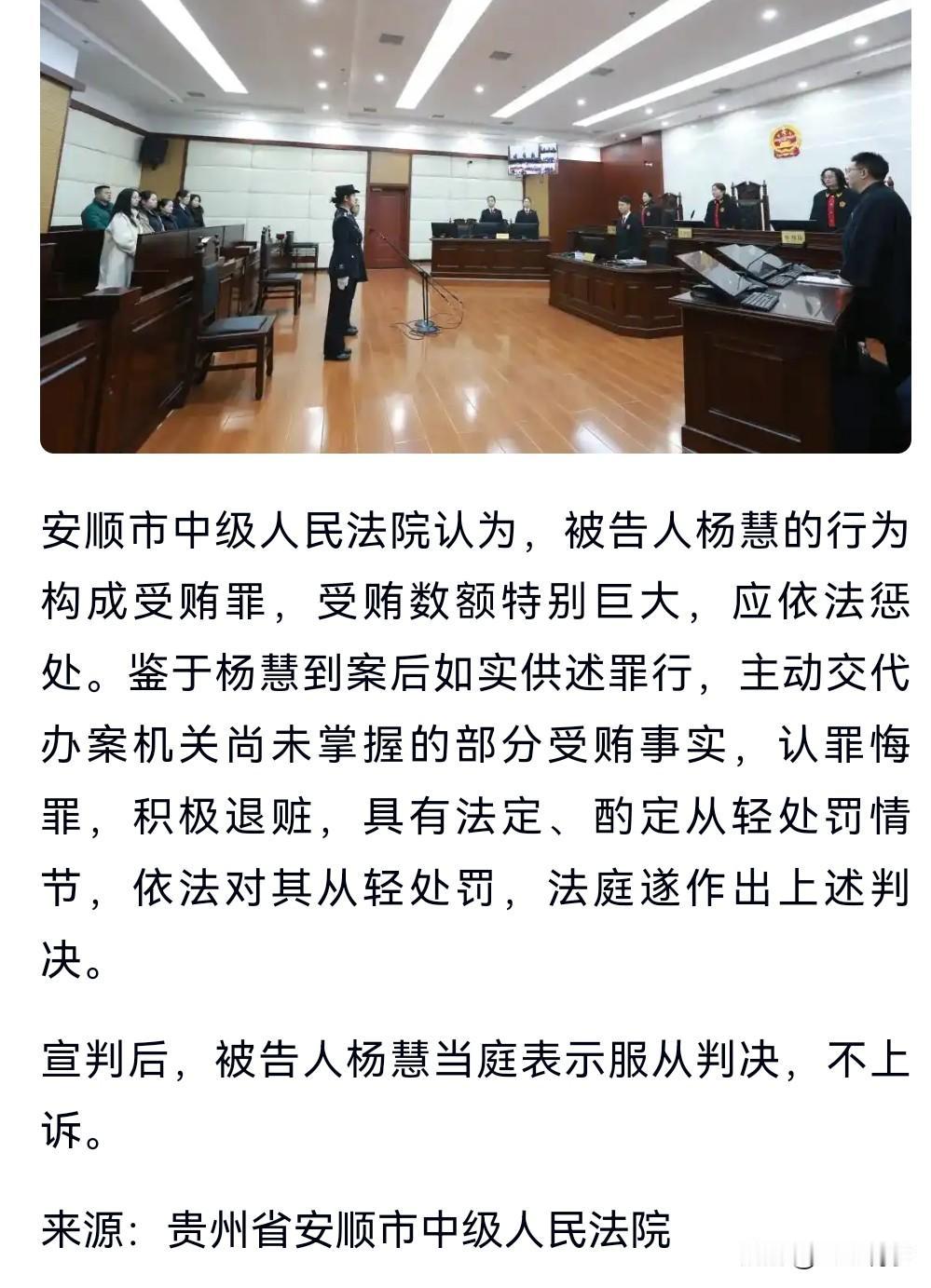 当官的千万别走错路,不要有侥幸心理,自我感觉不要太良好,当伸手的那一刻,就有可能要被抓。 2月5日热搜,受贿5448万余元,杨慧被判14年3个月。 值得一提的是,她并没有选择上诉,选择服从。 看来是有一定的悔改之心。 其利用职务之便,为相关单位和个人在医疗设备采购、工程项目承接、工作调动等事项提供便利。 受贿高达5000多万。 当然14年三个月,是在轻判的情况下,因为她主动交代问题、积极退赃等。 这也敲响了警钟,做人不能太贪。