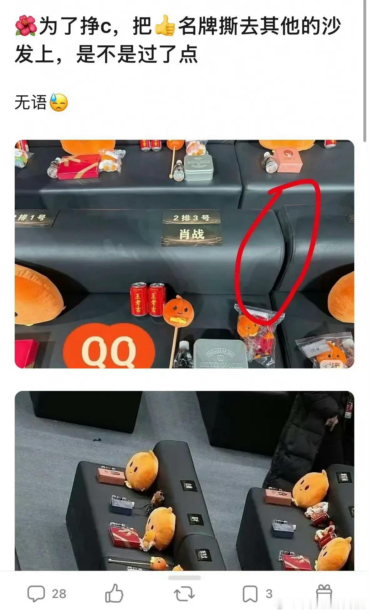 微博之夜内场疑似某85花为了争C位把肖战的座位条给撕了。最开始安排辛芷蕾旁边坐的应该是肖战,肖战上次在央视大湾区晚会也是坐的主桌,和成龙坐在一张桌子上,结果进了微博之夜坐到第一排的犄角旮旯里去了,这不太对吧🤔你们怎么看? 肖战 害羞笑