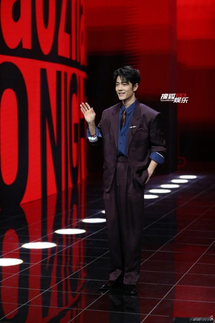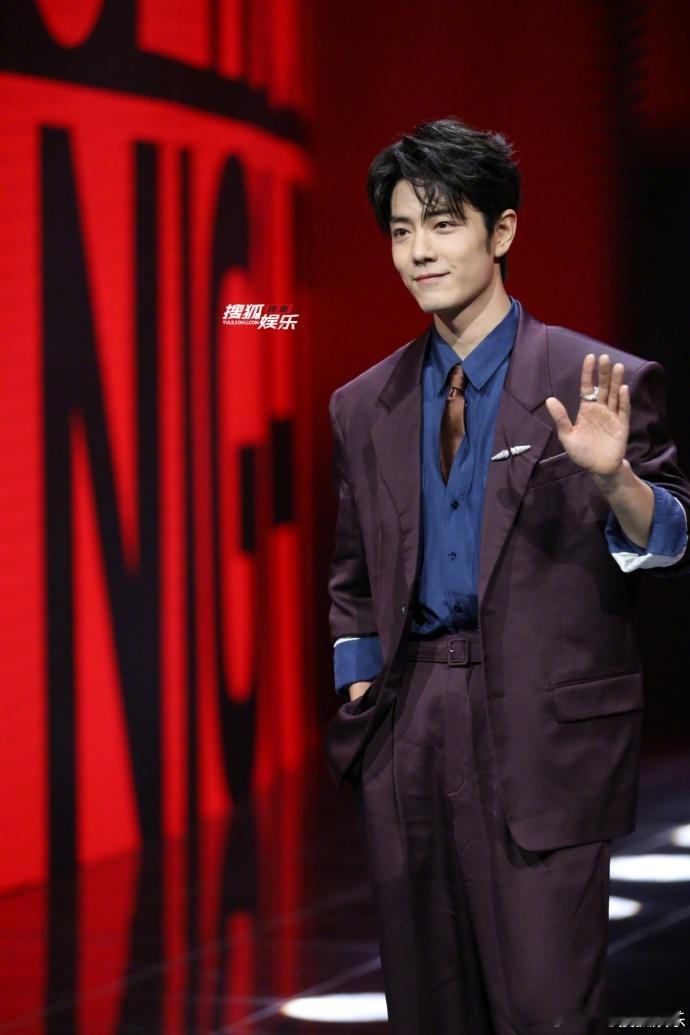 肖战红毯大屏好红肖战红毯现场大屏肖战红毯现场大屏,深紫西装搭配蓝衬衫,焦糖领带设计很有视觉感。