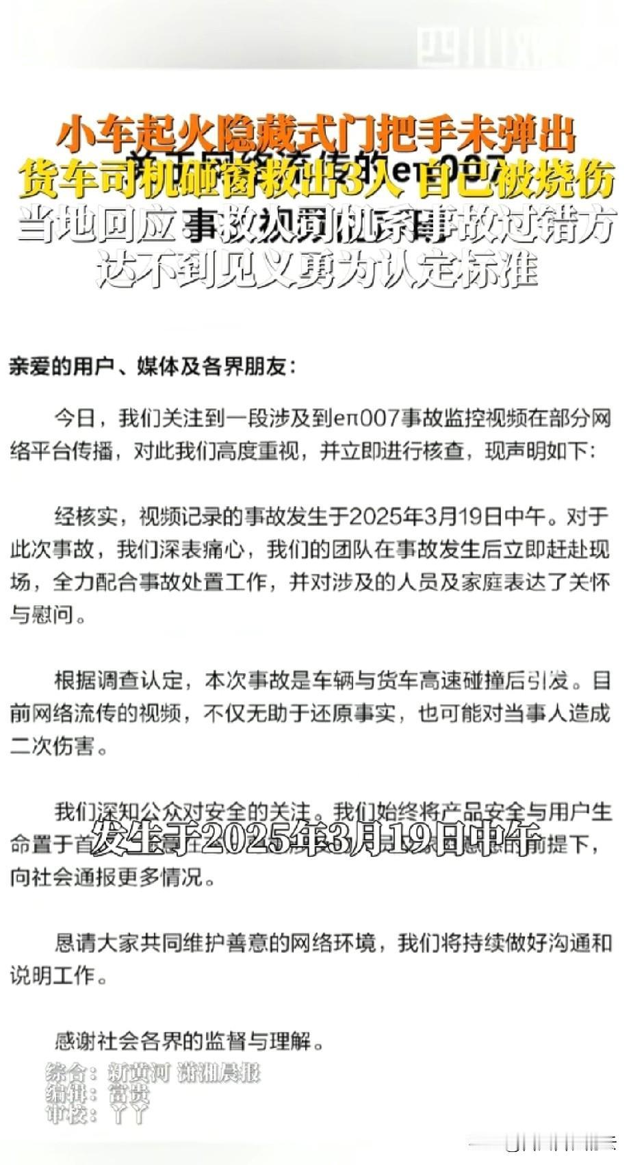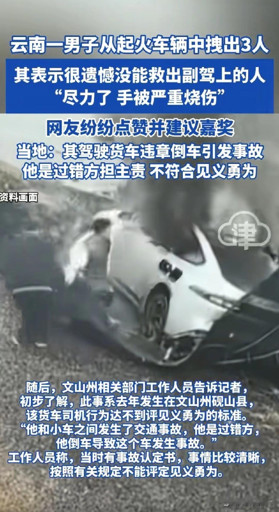 没想到白衣男子救人的事也反转了。事情发生在去年的3月份,有辆电车遭遇车祸起火,司机跑出来后,门突然关上。因为是网约车,里面还有好几名乘客。 当时大火蔓延,里面的人很危险,在这个危急时刻,有个白衣男子挺身而出,砸碎玻璃不断把人从车里拉了出来。在男子的努力下,除了副驾上的人没被救出,其他三人都获救了。男子的手也被烧伤。 这件事本来过去快一年了,后来视频又被传到网上,男子挺身而出的形象让网友点赞,被网友称为英雄。也有网友质疑当地政府,一个人救出三个人了,为什么没被认定为见义勇为? 今天官方回应了,男子不能被认定的原因是他和车祸有关,网约车是他的大货车倒车时撞倒的,他是过错方。也就是说,如果没有他,这个车祸也不会发生。所以按照相关规定,他的行为无法被认定为见义勇为。 因为这件事被重新带上热搜,电车的车企也出面回应,他们说这件事刚出事时,他们的团队就过去了,经过调查,发现事故原因和车子本身无关。他们也对涉事人员和家庭表示了慰问。他们不愿意这件事再传播,对受害者也是一种伤害? 也就是说,这件事已经处理完了。那白衣男子直播的时候为什么不说这些呢?虽然他救人的时候确实很勇敢,但是还原事情真相同样重要。 对于这件事,你怎么看呢?
