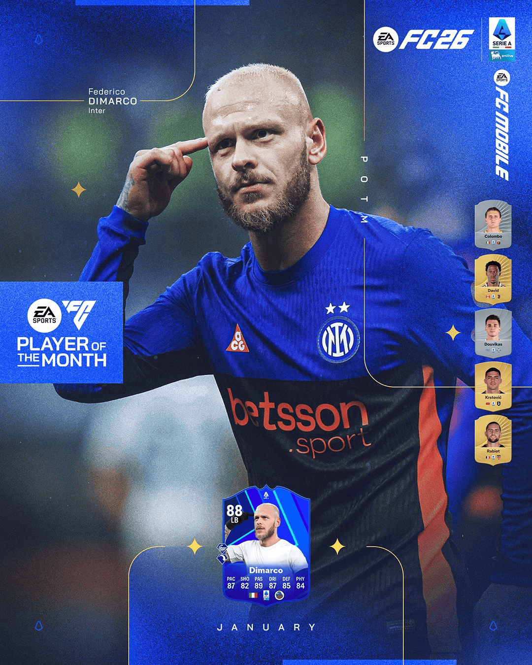 迪马尔科在一月份为国米出场5场意甲,贡献3球2助攻,其中对阵帕尔马、那不勒斯进球,对阵比萨单场1球2助攻。