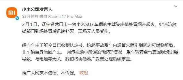两周不到,小米汽车就三次燃烧事件,小米2026年销量55万辆目标还能达到吗? 2026年1月19日一天两起、2月1日一起,这么短时间三起小米汽车燃烧事件,引发网络热议,也让小米市值大量蒸发!但核心结论明确:均与电池质量无关,实为遗留火源、外力碰撞等非车辆自身问题。 每次事故后,小米第一时间披露消防认定书、离线数据等实证,澄清谣言并协助善后,这种责任担当赢得理性消费者认可。这里提醒汽车车主,不要开太快车,不要放易燃物,甚至于阳光下不放置矿泉水! 说到安全性,小米依托-40℃至90℃极端环境测试体系与国标超高标准电池包,小米汽车安全根基扎实,第一代SU7 36万辆销量、新一代SU7半月10万订单便是佐证。 2026年55万辆目标并非遥不可及:YU7持续领跑细分市场,新一代SU7激光雷达、902km续航等升级点竞争力十足,叠加产能扩张与生态协同优势。只要持续强化用户教育与场景化安全优化,小米有望突破目标,在新能源赛道稳步前行。