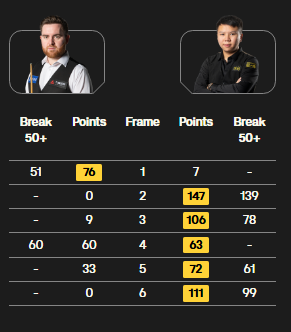 全场比赛,周跃龙打出一杆破百(139)和三杆50+(78、61、99),杰克-琼斯打出两杆50+(51、60)。