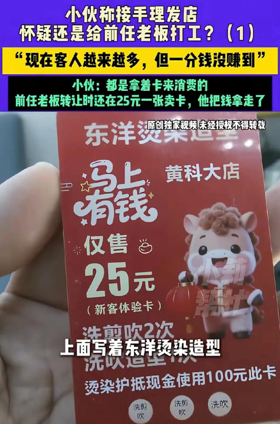 太不地道!河南郑州,男子新接手的理发店每天客人一波接一波,忙得脚不沾地,谁料,他却一分钱没挣到。男子委屈不已,找媒体哭诉:我就是给前任老板免费打工的,他转让店铺当天,还在大量售卖25元剪3次的理发卡,钱他收了,苦活累活全甩给我。而记者找到前任老板后,他的回答让人大跌眼镜。 牛先生是干理发的,前阵子他一直托人找店铺,因为年关将近,正是理发、做头发的旺季,他希望年前能开一家店顺利做生意。 1月26日那天,牛先生接到一个电话,对方称因为个人原因,打算转让他干了多年的美发店。 两人在电话里简单沟通后约定次日到店里详谈。 第二天,牛先生按照那个老板给他发的地址,找到了那家美发店。 牛先生实地考察后,觉得店铺位置和店里装修各方便都合他心意,于是决定收下那家店。 1月28号,牛先生和前任老板正式签订转让仪式,并给对方转去转让费。 1月29日牛先生把店名更改成属于自己的店名,顺利开业。 牛先生开店后,每天店里来剪发的客人很多,一波接着一波,他和工友们忙得脚不沾地。 虽然每天来了很多客人,但是他却几乎不赚钱,因为这些客人他们都是带着一张卡片来剪头发的。 卡片上面写着东洋烫染造型,黄科大店,洗剪吹2次、洗吹造型1次,烫染护可以抵100元现金券,卡片只需25元。 卡片上的店名是上任老板的店铺名称,后来牛先生经过了解才知道,这些顾客是在1月26号到1月29号期间花25块钱从上任老板那买的卡片。 钱是上任老板收的,干活的却是牛先生一伙人,自己辛辛苦苦却一分钱没赚到,牛先生郁闷不已。 一开始牛先生想着就当是为他的店铺做宣传,为长远打算,可后来拿卡片来剪头发的人越来越多,他有些受不了了,就推掉部分客人。 没想到因为被推掉,小区物业群里炸锅了,有人说牛先生的店铺做虚假宣传,这个店没诚信,各种不好的声音纷纷针对牛先生店铺。 牛先生为这事苦恼不已,他联系上任老板想让他出面解决,可那老板却躲着不处理。 牛先生没办法联系了当地媒体,之后记者跟着牛先生找到了上任老板。 可能迫于压力,上任老板跟记者解释说,这个店他之前从没打算转让,是临时有这个想法的,所以他们一直在想办法宣传、搞活动,26号确定转让给牛先生后,27号他就停止销售卡片了。 可牛先生说,顾客直到28号还能买到卡片。 对此,上任老板解释说,他们是跟地推公司合作的,27号就跟他们说了不再卖卡片,之后是地推公司私自卖的。 最终经过记者调解,上任老板承诺,他会把这个事处理好,他说他收了谁25块卡片钱,会一一退回给人家。 有人说牛先生这格局小了,上任老板是帮他宣传啊,地推还要钱呢。 他也不太会经营,这免费的流量多好呀,前期有顾客,服务好了,后期会有稳定客源,理发是个长期生意,不能只计较眼前 都说吃亏是福,现在吃点亏,以后就会生意兴隆财源广进。 不过也有网友说,上任老板这做得太不地道了,没准他是故意设局,转手前恶意低价倾销,捞一笔跑路,账后续老板来还。 前任老板这波操作太没底线,明摆着把牛先生当“冤大头”!都敲定转让店铺了,还偷偷卖低价理发卡圈钱,收了钱拍拍屁股走人,把一堆烂摊子甩给接手的牛先生,这根本不是无心之失,就是故意的投机算计。 牛先生本想趁旺季开店赚钱,结果白干不说,还被顾客骂没诚信,平白受了委屈背了锅。 说牛先生格局小的纯属站着说话不腰疼,谁的辛苦都不是大风刮来的,免费干活还挨骂的亏,换谁都咽不下。 不过,幸好最后前任老板承诺退钱,也算给牛先生讨了点公道,不然这亏吃得也太冤了!