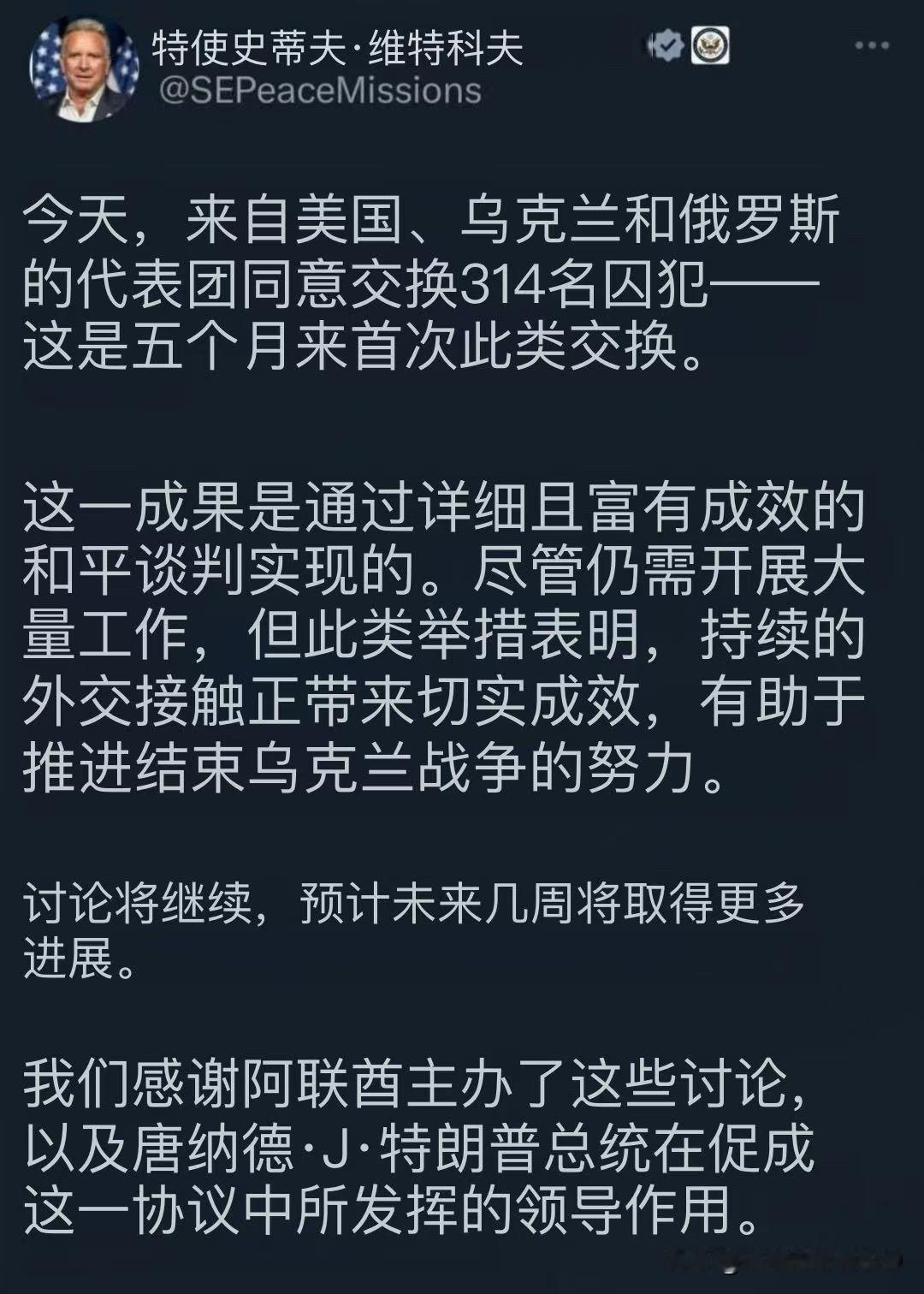 俄乌在阿布扎比的第2轮第2天谈判结束,达成一项换俘成果——美国特使维特科夫在俄美乌三方谈判结束后发文表示,谈判细致而富有成效。 维特科夫在文中表示,在乌克兰与俄罗斯、美国的三方谈判中,双方就交换314名俘虏的事宜达成了协议。 维特科夫说,“在今天,来自美国、乌克兰和俄罗斯的代表团同意交换314名囚犯,这是五个月来首次此类交换。 这一成果是通过详细且富有成效的和平谈判实现的。尽管仍需开展大量工作,但此类举措表明,持续的外交接触正带来切实成效,有助于推进结束乌克兰战争的努力。” 维特科夫在文中还表示,三方之间的讨论还将继续下去,预计在未来几周将取得更多进展。 维特科夫还感谢阿联酋主办了这些讨论,以及美国总统在促成这一协议中所发挥的领导作用。 值得注意的是,此次谈判结束后,俄罗斯与乌克兰方面在白俄罗斯与乌克兰边境处,进行了一次战俘交换,交换人数为157与157。双方向对方移交了这些被俘虏的士兵,并均已得到证实。 此外,俄罗斯方面还接收了三名居住在库尔斯克地区被乌克兰抓走的俄罗斯平民。