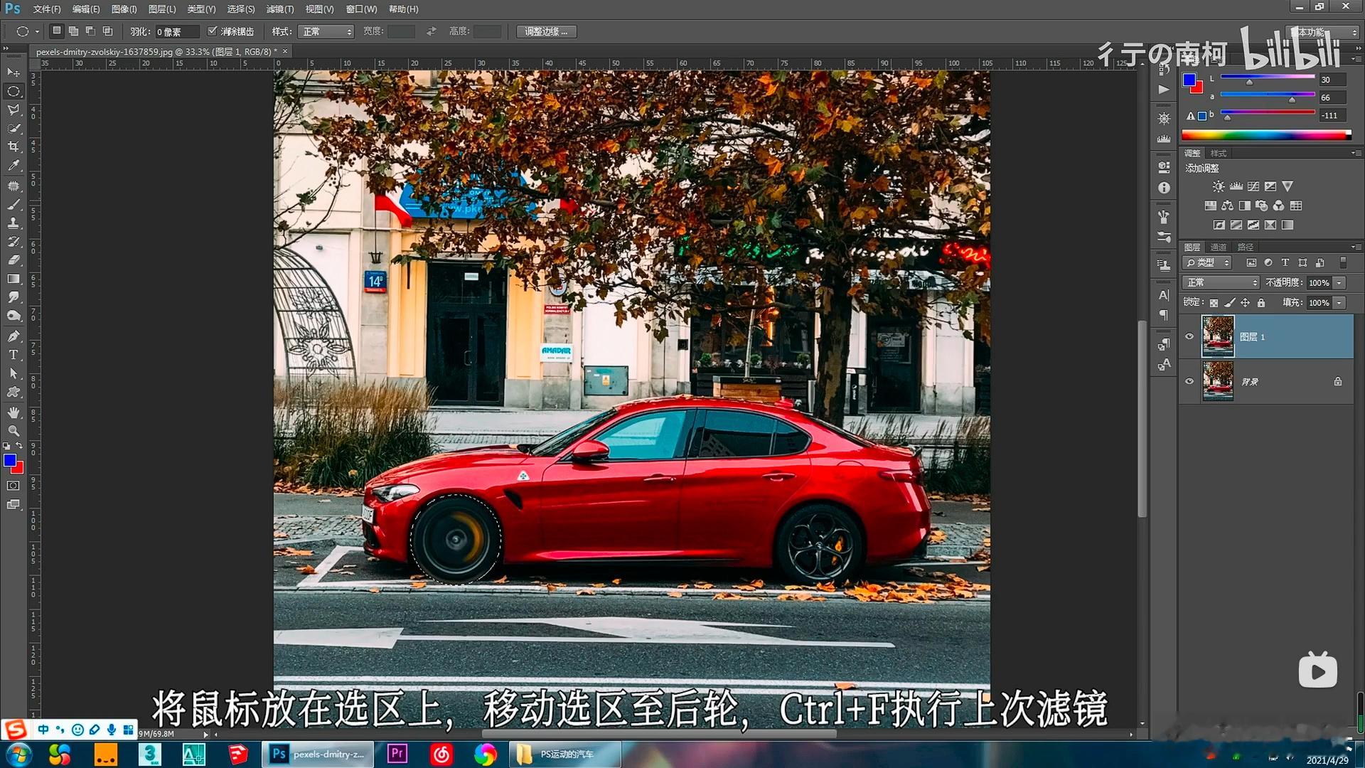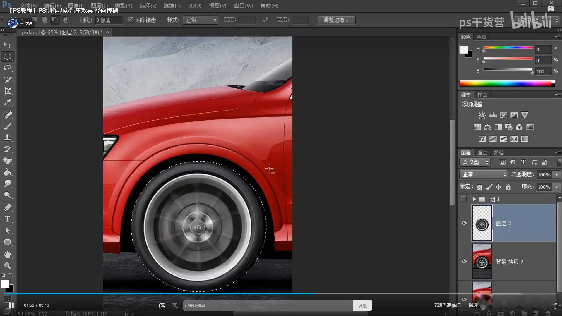 刚还看了B站汽车动态模糊制作教程(图七、图八、图九),好像都是将整个轮胎轮毂一起选区模糊处理,没有轮毂模糊但轮胎清晰的教程。