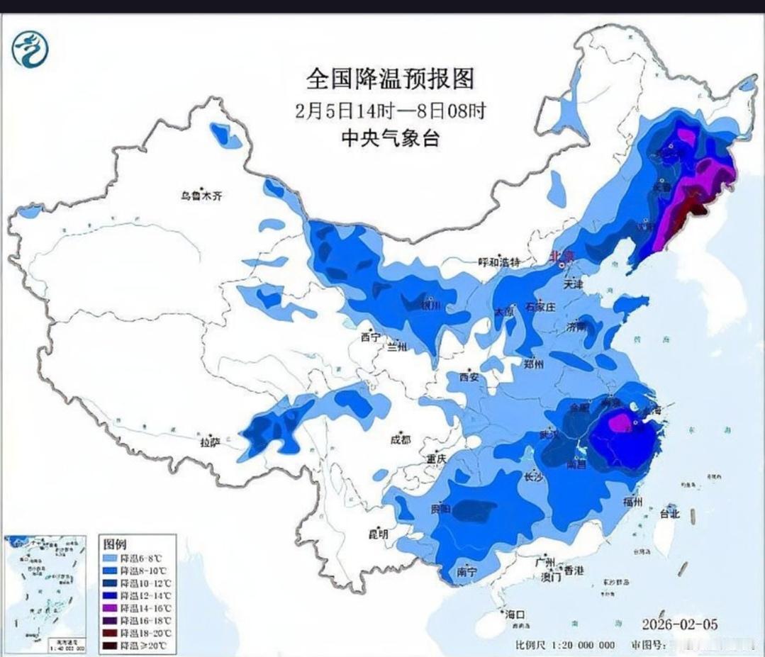 2026年新一轮寒潮来袭,中东部地区气温狂降,多地将迎大到暴雪,你的城市“冻”真格了吗? 今天是2026年2月5日,我国中东部地区正遭遇新一轮寒潮的猛烈冲击,气温将大幅下降6至10℃,部分地区降温幅度甚至超过20℃,让人不禁感叹这天气真是说变就变。此次寒潮不仅带来了刺骨的寒冷,还伴随着大范围的雨雪天气,江苏、安徽、上海、浙江中北部等地更是将迎来大到暴雪,局地甚至会出现大暴雪,出行安全需格外注意。中央气象台已经发出了大风蓝色预警,提醒大家务必做好防风保暖措施,避免感冒等疾病的发生。此轮寒潮不仅影响人们的日常生活,还可能对交通、农业和能源供应造成一定冲击,相关部门需提前做好应对准备,确保人民群众能够安全温暖地度过这个寒冬。 寒潮来袭,大家一定要做好保暖措施,安全出行哦!你所在的城市降温了吗?快来评论区分享你的感受,一起聊聊如何应对这突如其来的寒冷吧!寒潮预报 低温寒潮天气