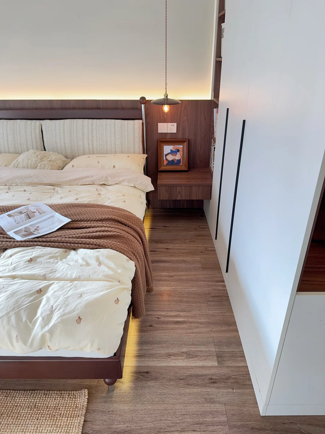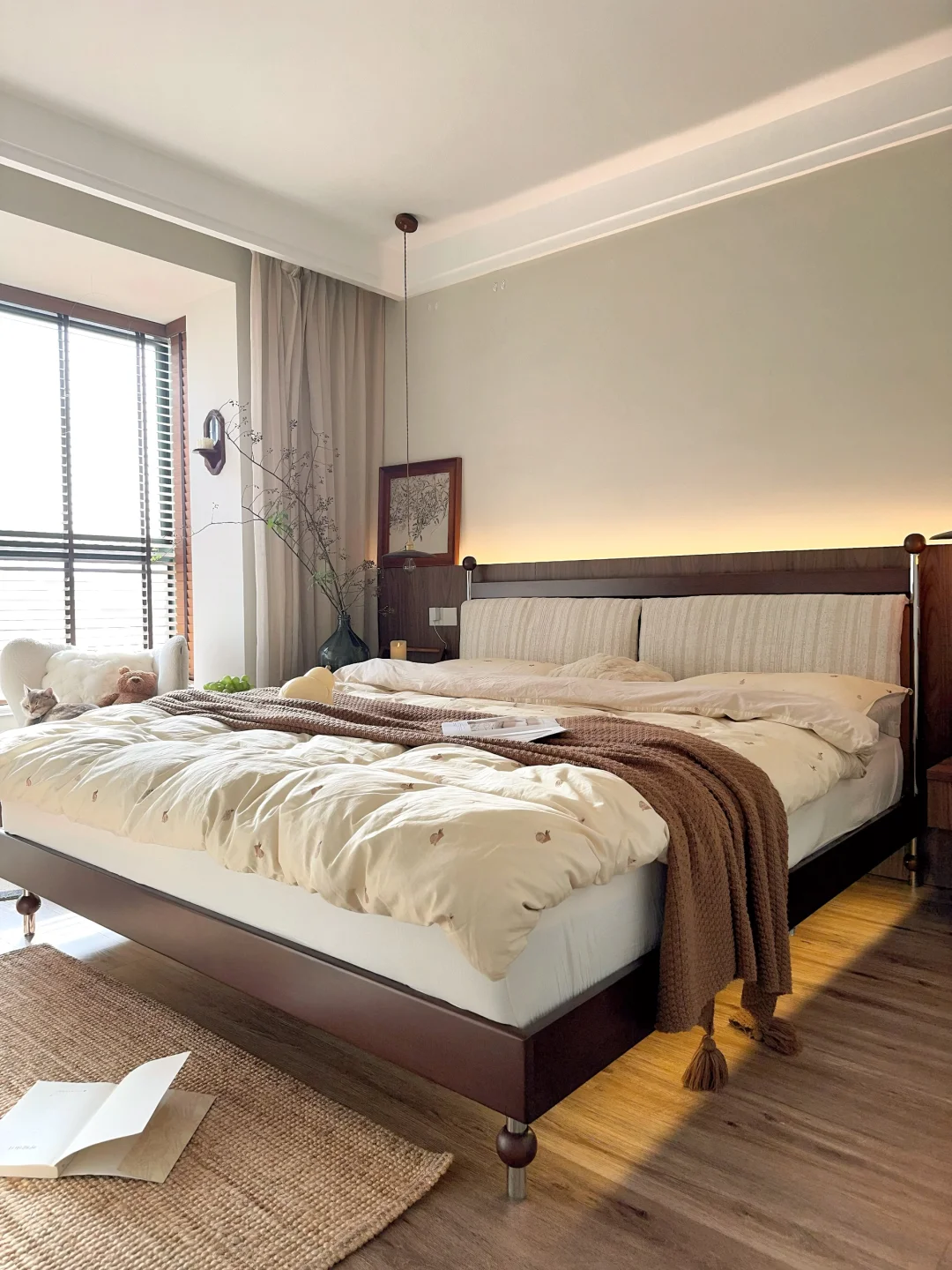 北美进口黄杨木的床架自带温润光泽,搭配暖调奶油色墙面,整个卧室的氛围一下子就温柔了。