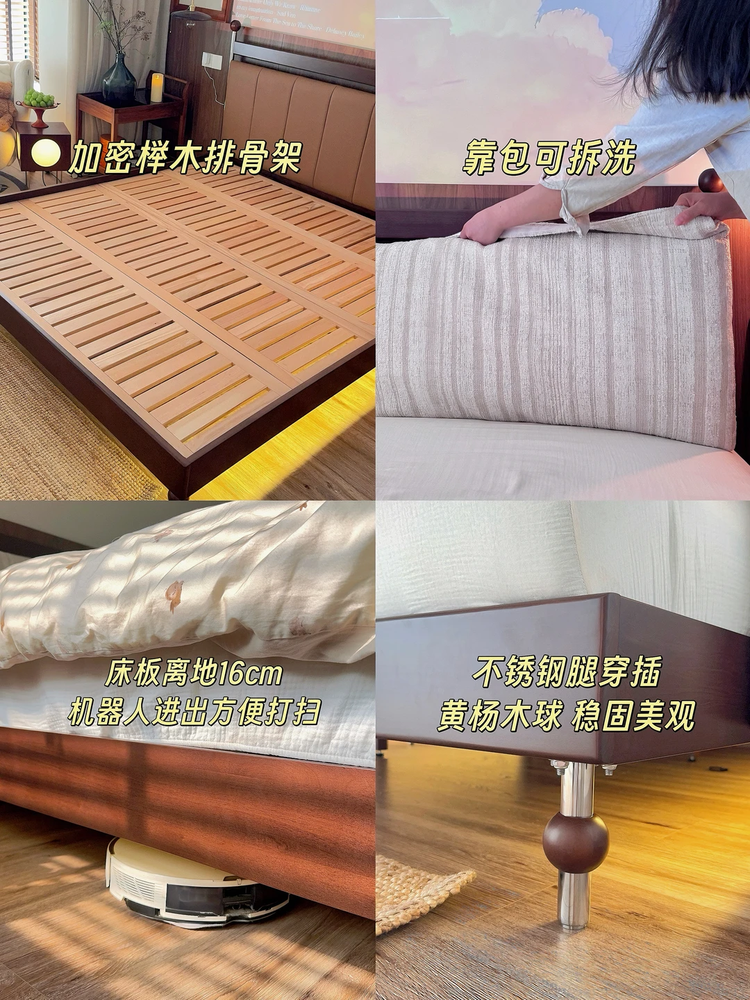 • 清洁无死角:床体离地16cm,扫地机器人能轻松钻进去,日常打扫省了我好多力气。