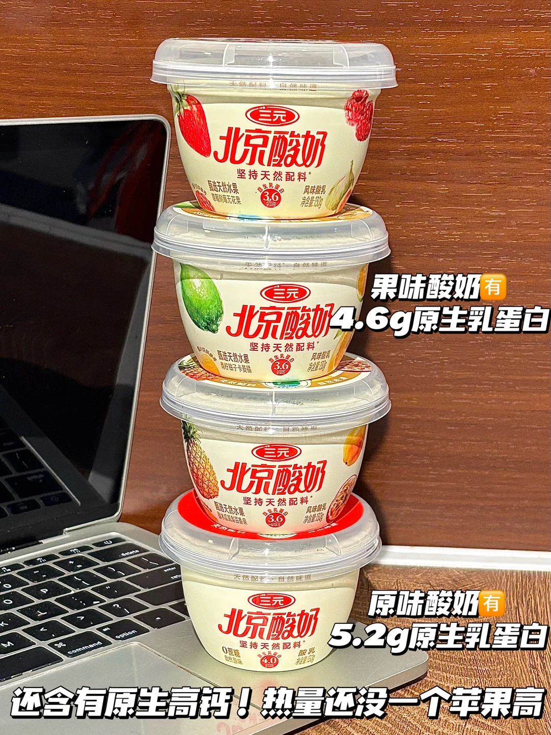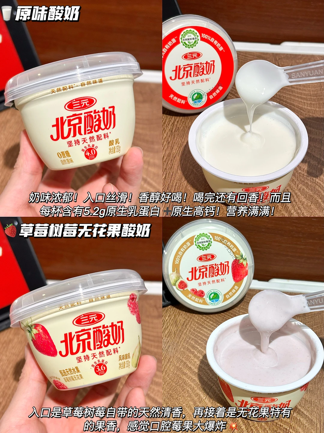 每杯果味酸奶都含有4.6g原生乳蛋白➕原生高钙➕天然维生素,原味的乳蛋白含量更高,有5.2g,营养价值没得说👍🏻