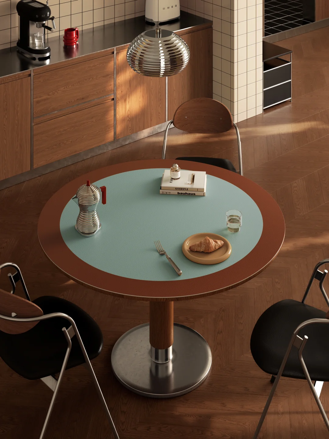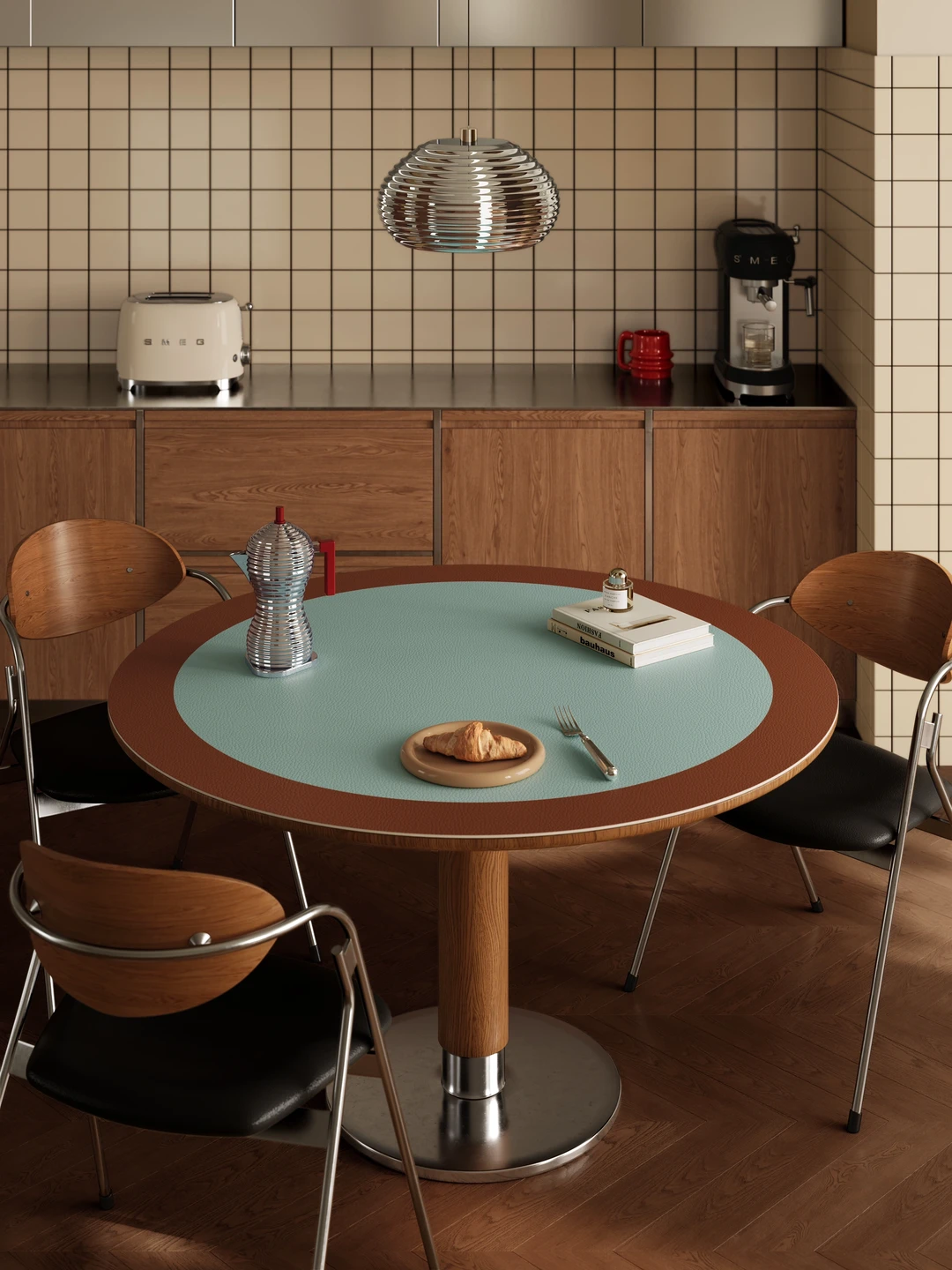 秋冬松弛感直接拉满 —— miumiu 蓝 + 深棕底撞色把中古咖啡馆的氛围感直接铺在餐桌☕ 蓝是自带滤镜的 miumiu 奶蓝 像从 90 年代复古画报里抠出来的色调往圆桌上一铺,摩登复古感 max - 皮革质感软糯又挺括,防水防油的属性让日常打理毫无压力 蓝棕撞色的设计既跳脱又和谐,不管是原木风还是工业风都能完美融合 随手摆上咖啡壶、牛角包和杂志,就是一张可以直接发杂志内页的餐桌大片📸