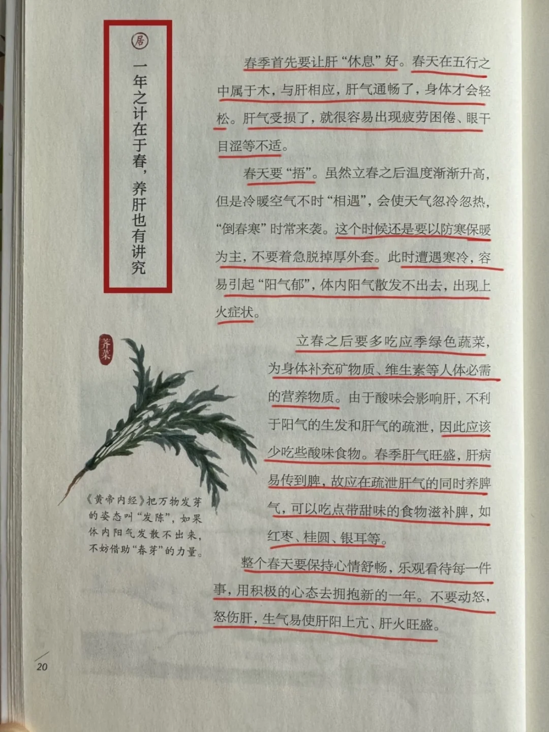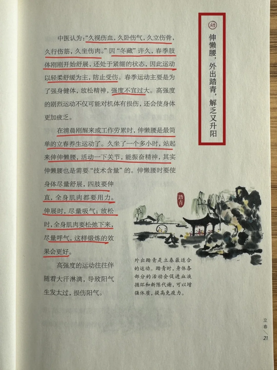 冬藏许久,春季肢体开始舒展,运动要以轻柔为主。书中还教我们正确伸懒腰,大家感兴趣的可以看看。