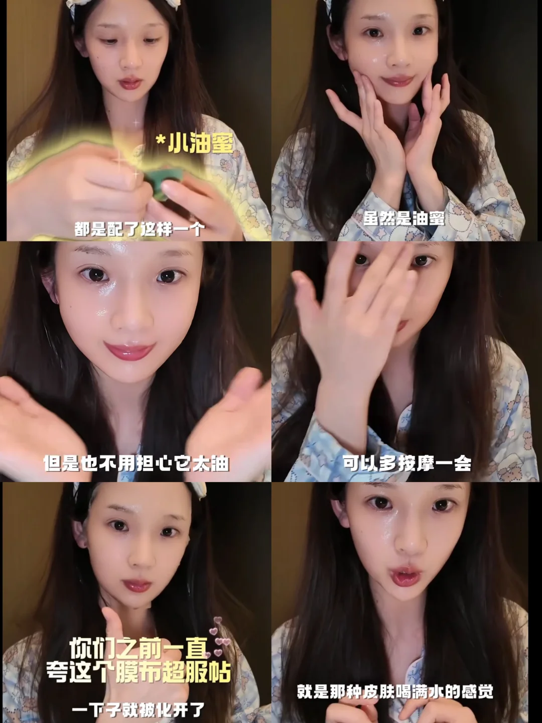 她是先把油蜜涂抹在脸上,轻轻按摩让它吸收下,这个油蜜一看就是滋养挂的!发热的时候还能打开毛孔促进吸收,一举两得!看她揭开的时候皮肤真的变得细腻很多,按上去也弹弹的很饱满,真的很适合我这种脸一缺水用什么补水面膜都补不进去的人~好了!看了个vlog的功夫还种草了新的面膜[买爆R]!