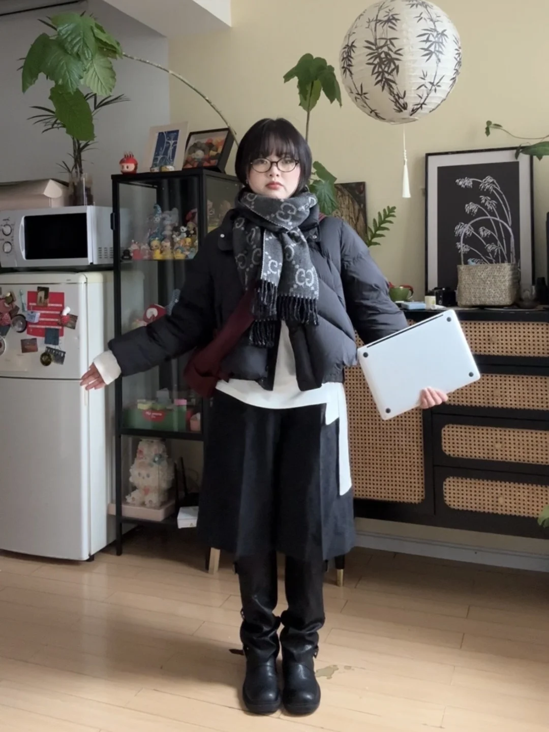这套穿搭把“贵气精致”拿捏住了!黑色大衣+毛绒围巾的组合保暖又有质感,亮片短裙和