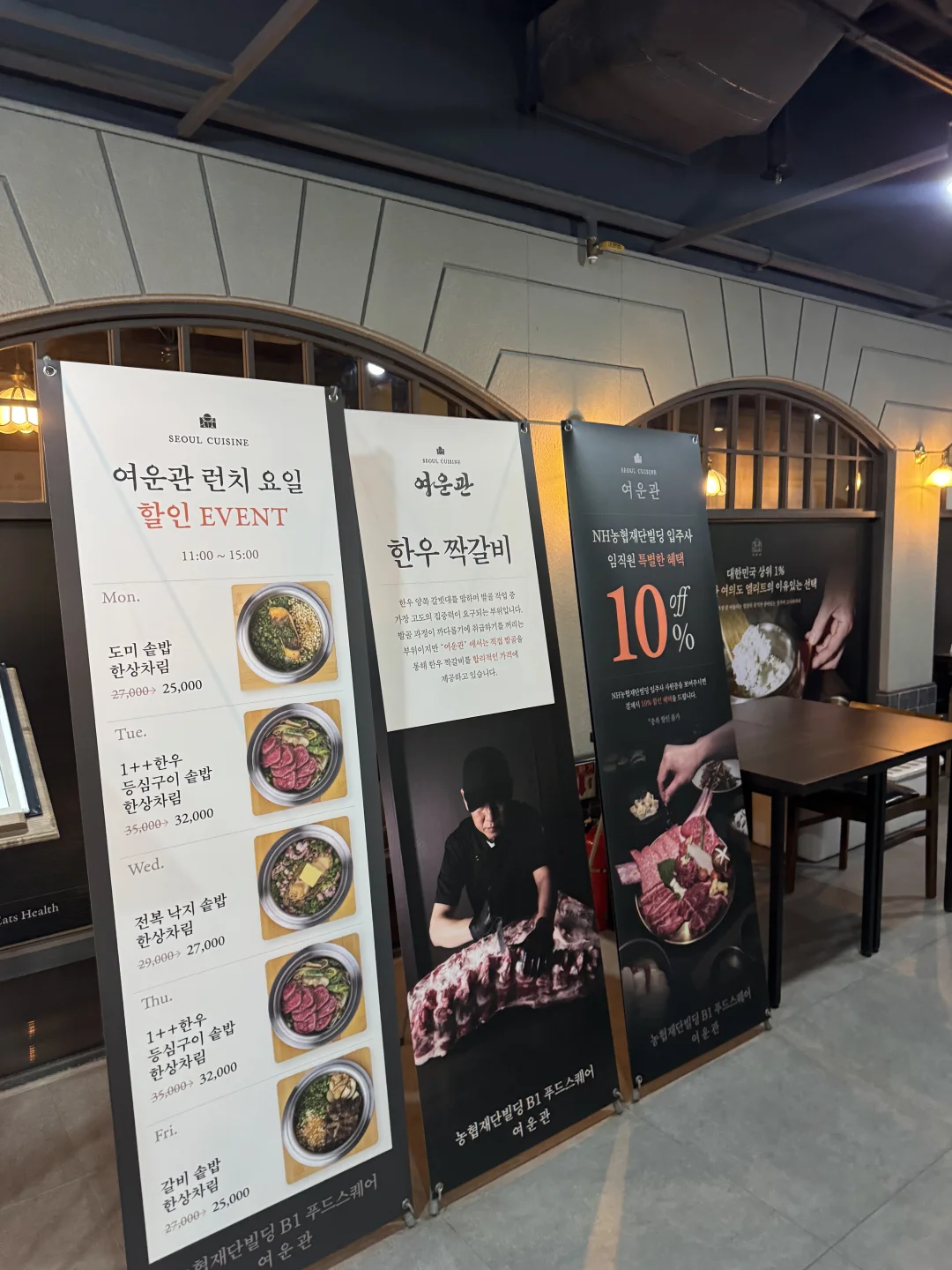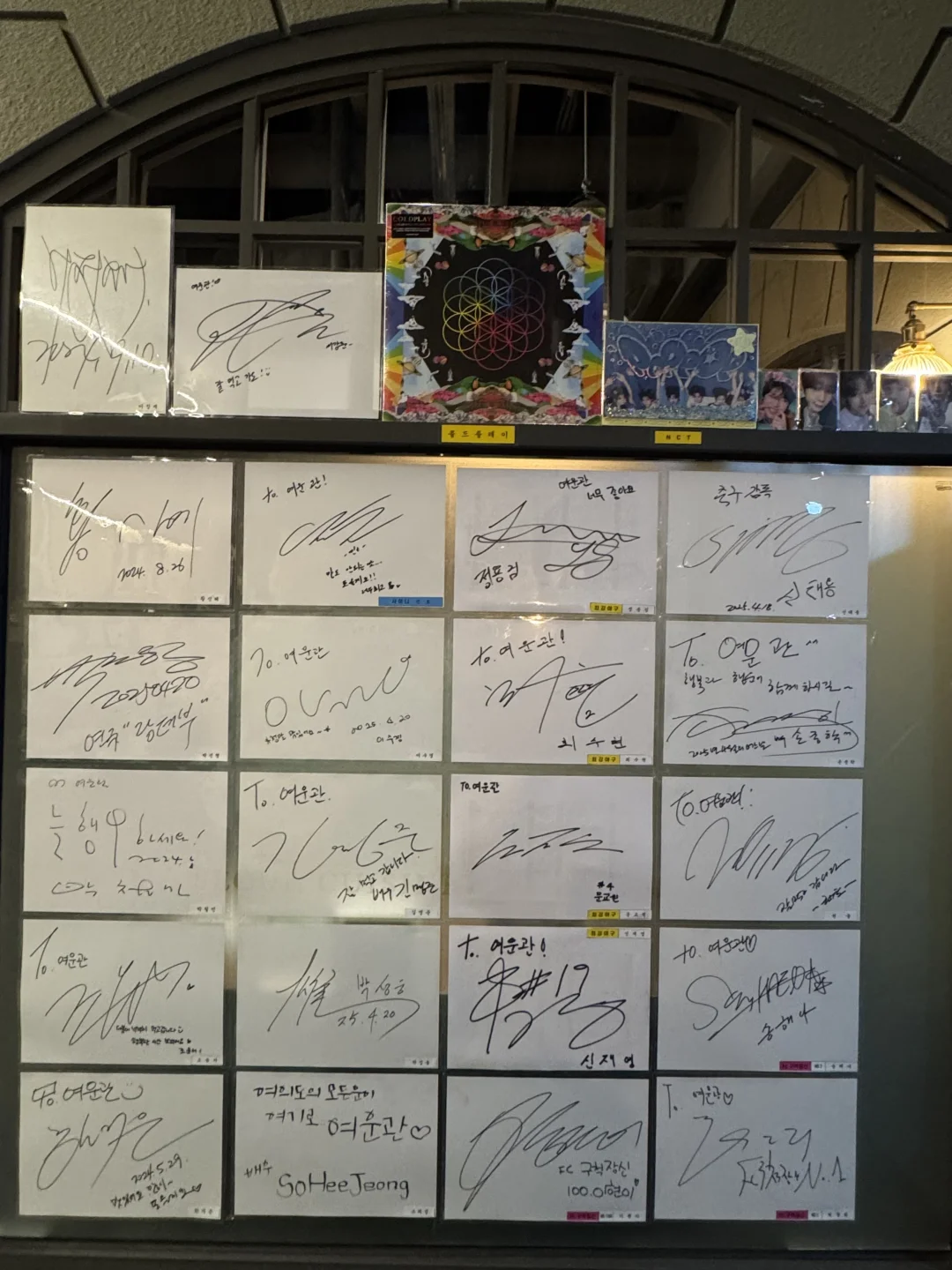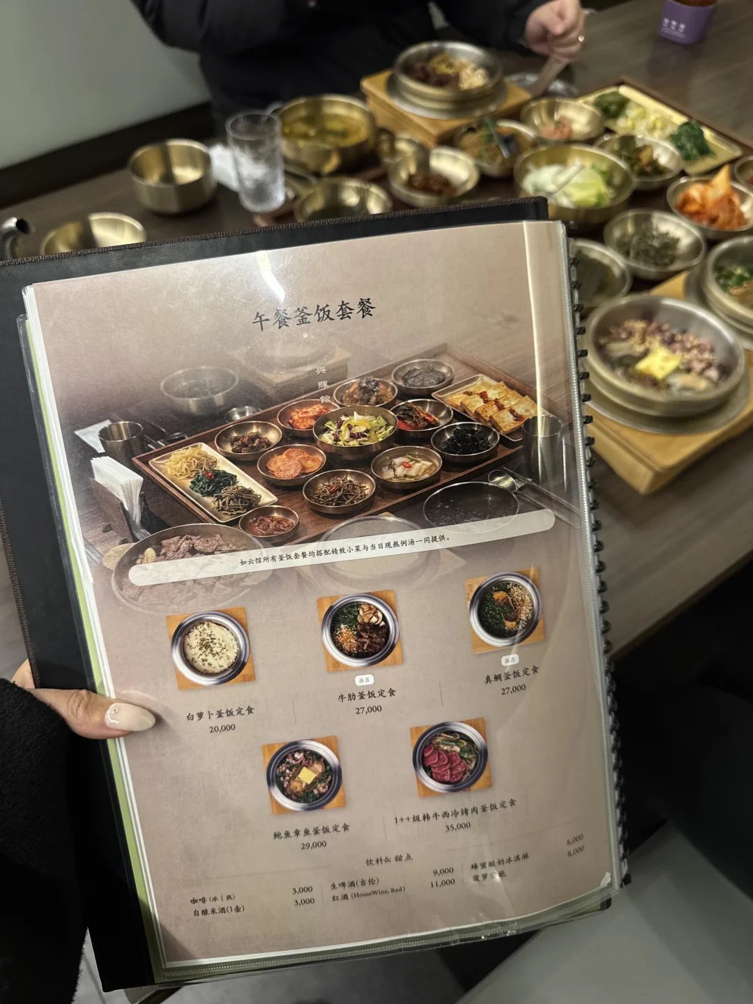 收藏很久终于来吃!他家超多明星来吃过的! 整面墙的签名✍️Coldplay、NCT同款餐厅… 我们三个人选了午饭釜饭定食套餐…他家还有韩牛烤肉可以选 人均的话27000韩币左右… 选了招牌牛肋釜饭、鲍鱼章鱼🐙、真鲷鱼釜饭 - 第一次看到午饭定食给上十几种的小菜… 量特别大!很丰富… 重点是门口还有自主爆米花、咖啡、五谷杂粮饮品可以喝… 走时还可以拿测运势的口香糖… 不愧是蓝丝带餐厅,就在汝矣岛附近! 🏠與賱館여운관