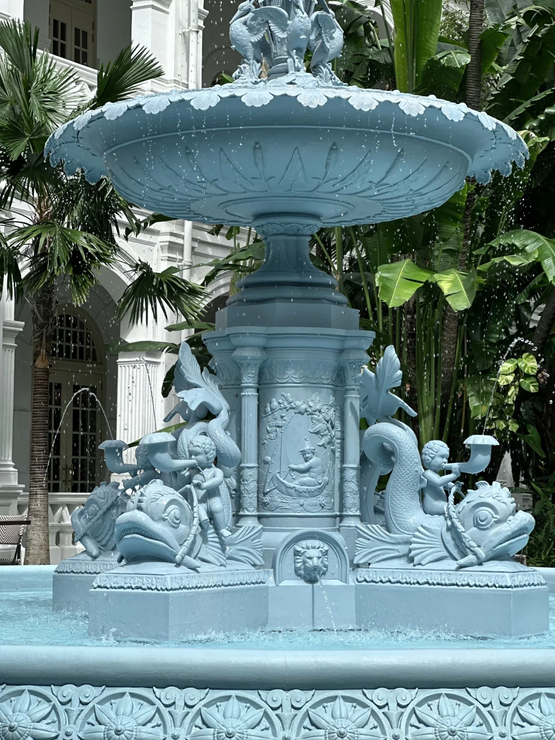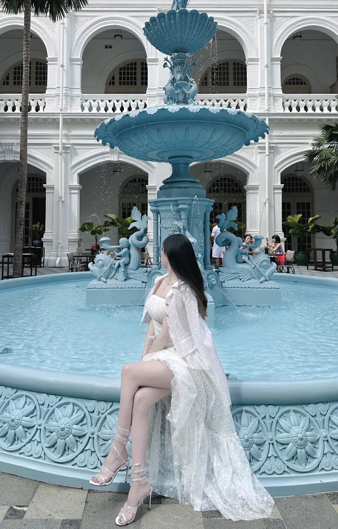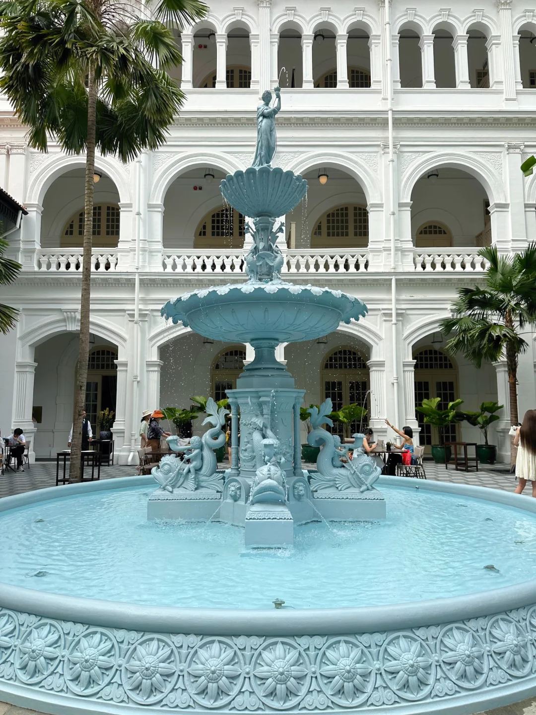 莱佛士的梦幻蓝色喷泉和椰林白色连廊 下午茶时间 慵懒又惬意