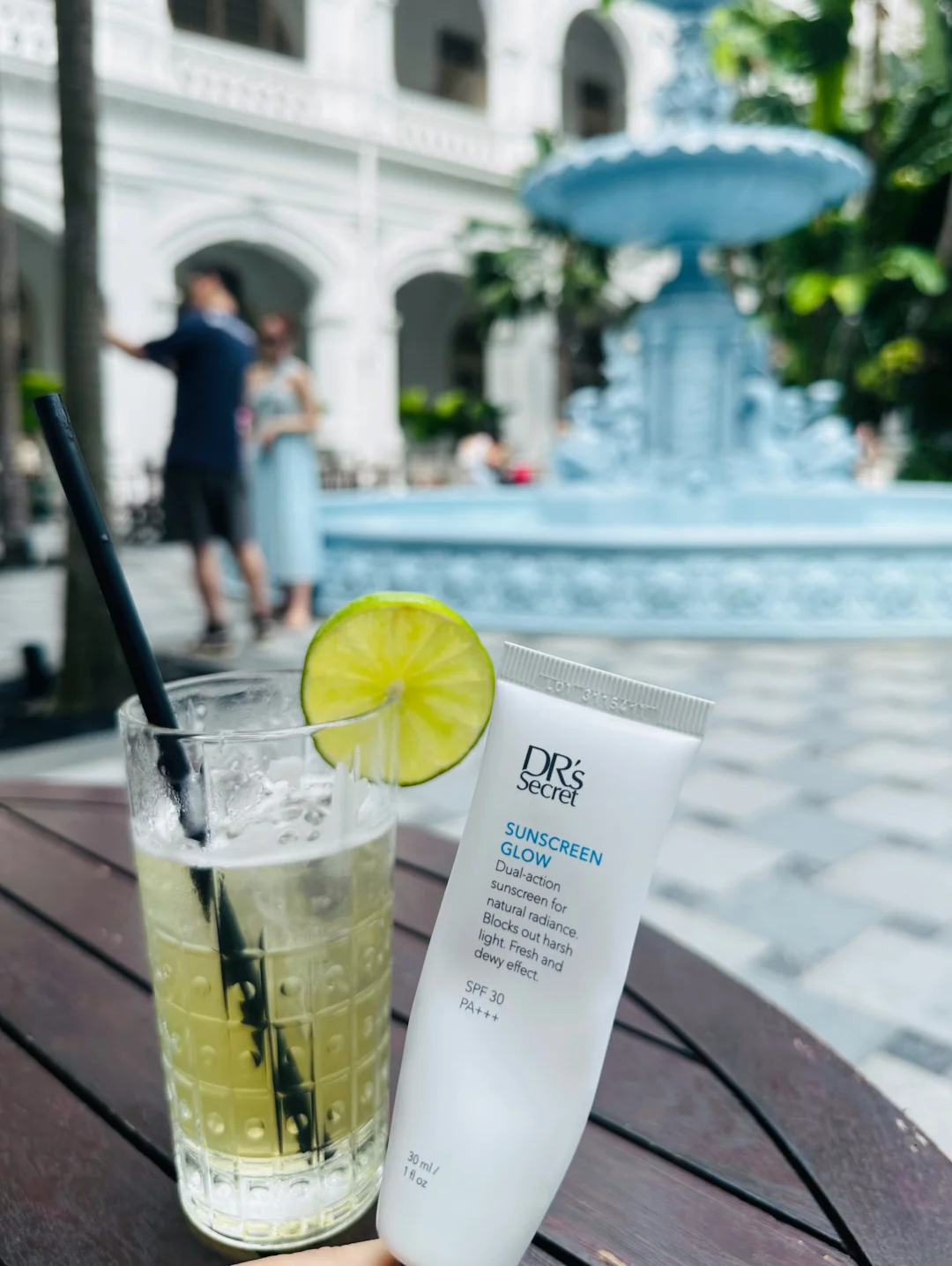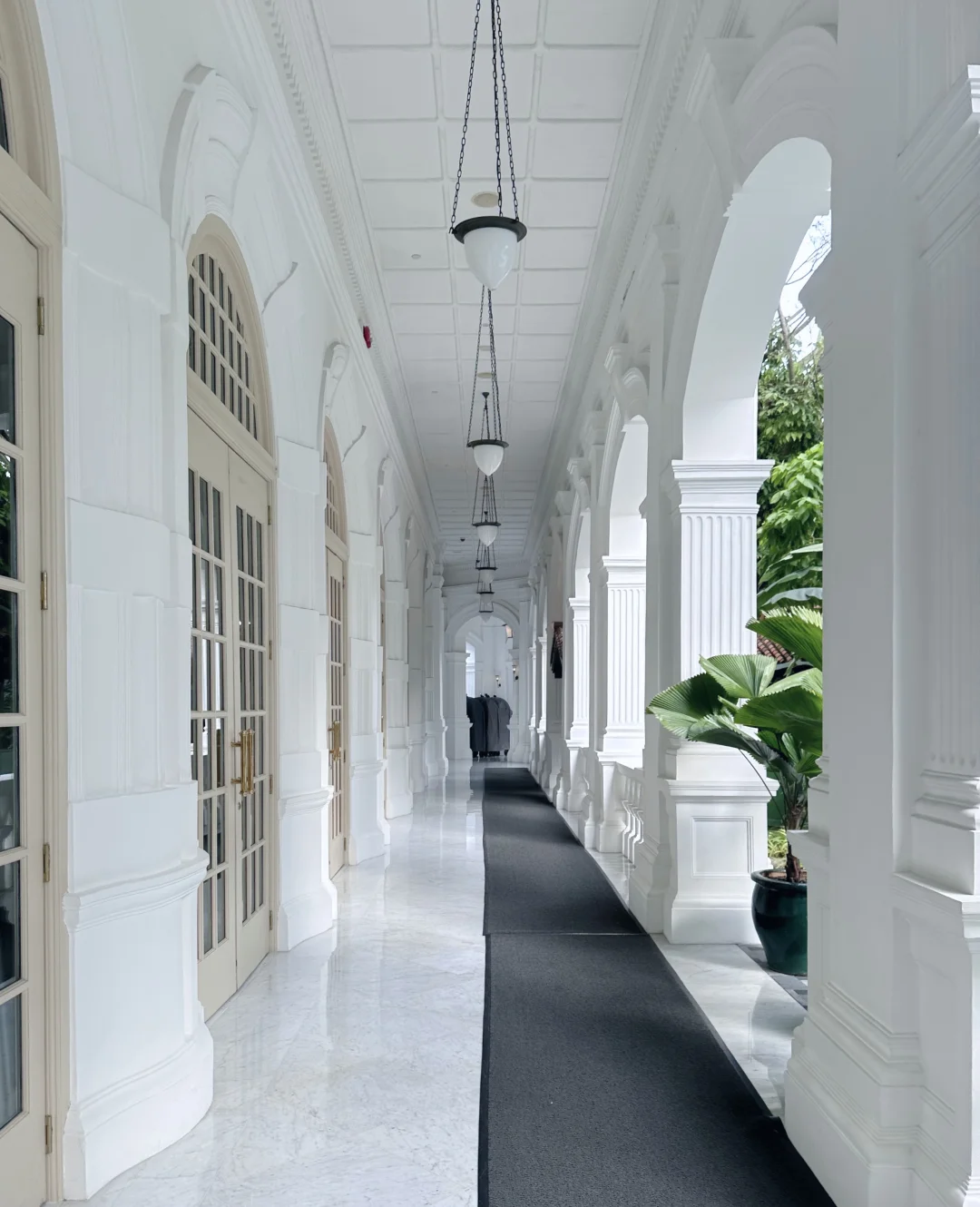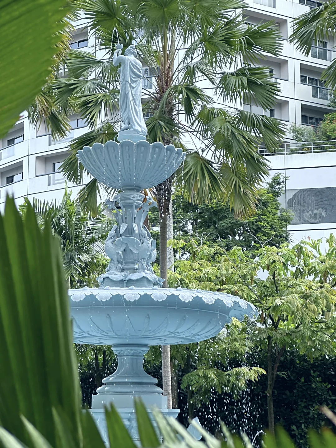 莱佛士的梦幻蓝色喷泉和椰林白色连廊 下午茶时间 慵懒又惬意