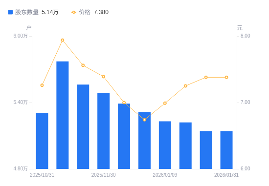 日期A股户数(户)流通A股户均持股数(股)户均持股市值(万元)2026-01-305141918336.2313.532026-01-205220518060.1613.092026-01-095230518025.6312.602025-12-205313617743.7211.962025-12-105390517490.5912.242025-11-305487017182.9912.702025-11-205561916951.5912.822025-11-105771616335.6912.972025-10-315303317778.1912.912025-10-205264917907.8512.63