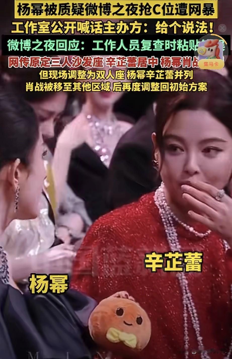 微博之夜回应杨幂抢C位质疑 2月5日,微博之夜内场座位变动引发热议,杨幂被质疑“抢C位”。据悉,盛典原定第二排为三人沙发座,辛芷蕾居中、杨幂与肖战分列两侧,现场却临时调整为双人座,杨幂与辛芷蕾并列而坐,肖战被移至其他区域,后续座位才恢复初始方案,这一变动让网友纷纷猜测“抢C位”。 当晚,@杨幂工作室 发文回应:“很突然,很震惊,很无奈,@微博之夜 给个说法吧!”粉丝也质疑主办方临时改座位却未提前沟通,呼吁正视争议。随后,微博之夜官方作出回应,称此次座位及人名条贴纸引发的问题,是场地下午布置完毕后,工作人员复查时粘贴错误导致,对此向涉事艺人及粉丝诚恳致歉。