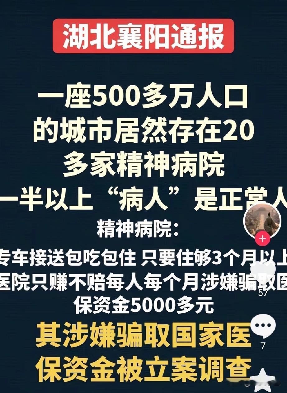 国家卫健委已经出手了,派了一个专家小组,前往湖北襄阳和宜昌两地开展调查! 主要调查这些私人开的精神病医院骗取国家医保资金的情况! 看到这个消息,当地的医保部门、相关精神病医院估计已经瑟瑟发抖了吧! 这个调查小组不是来走过场的,他们是来找问题和解决问题的,最终是要有人出来担责的! 如果真的像网上反应的一样,一些精神病医院为了骗保,让正常人冒称精神病患者,免费包吃住,不让这些正常人出院,那么问题就大了,结果不是一两个人能承受住的,趁早交待清楚问题,不要硬撑了!