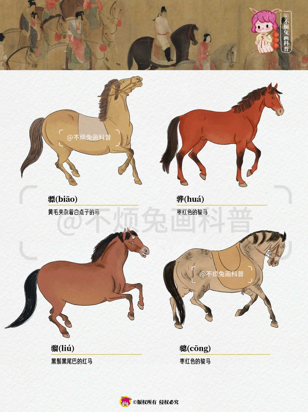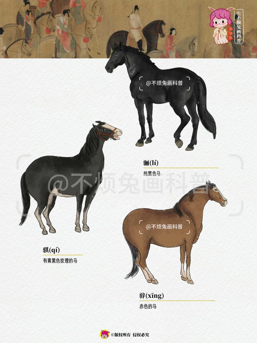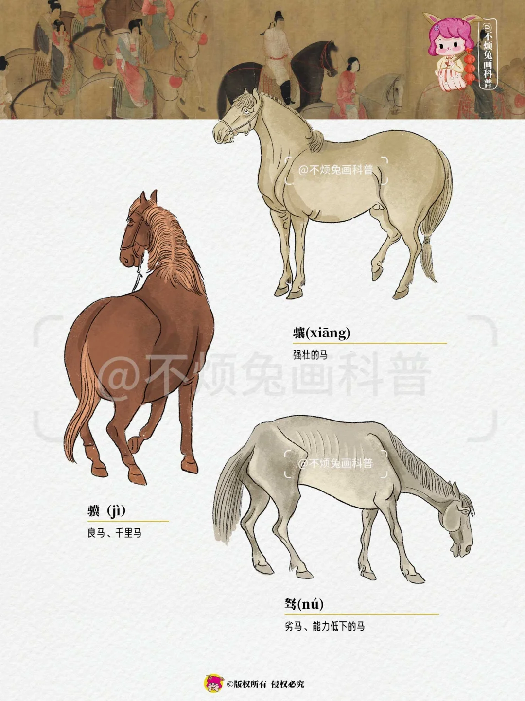 🐎在中国古代,马不仅是"交通工具",更是顶流IP——农耕靠它,打仗靠它,连社交排面都靠它!先民对马的辨识,精准如一部活体辞典——不仅辨其骊、骐、骅、骝等斑斓毛色,更依据其齿序称“驹”“骠”“驙”,依其行速唤“骏”“骁”“骥”。每一缕鬃毛的色泽、每一处蹄腕的斑记、乃至其嘶鸣的气韵,都可能凝成一个独特的名字。今天和不烦兔一起来看看吧!