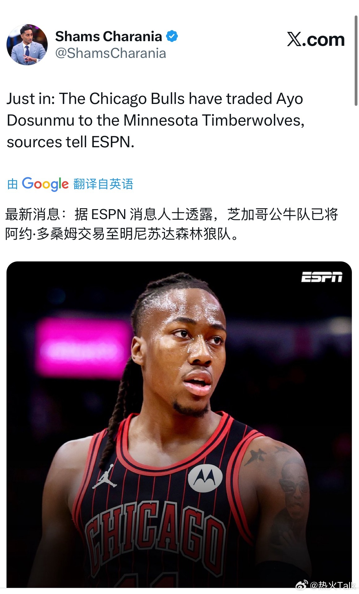 Shams:据 ESPN 消息人士透露,芝加哥公牛队已将阿约·多桑姆交易至明尼苏达森林狼队!