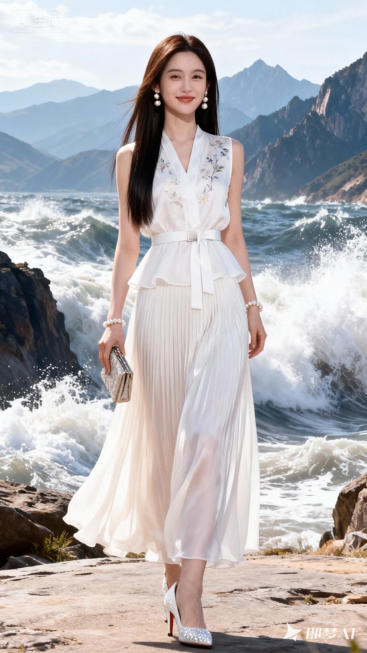 在壮丽的瀑布前,优雅白裙与自然美景相映成趣。