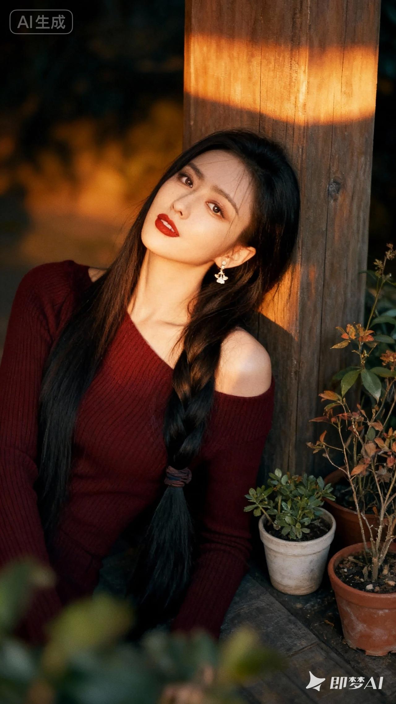 夜晚的静谧时光,红衣女子倚靠木柱,耳畔轻语,仿佛诉说着不为人知的故事。