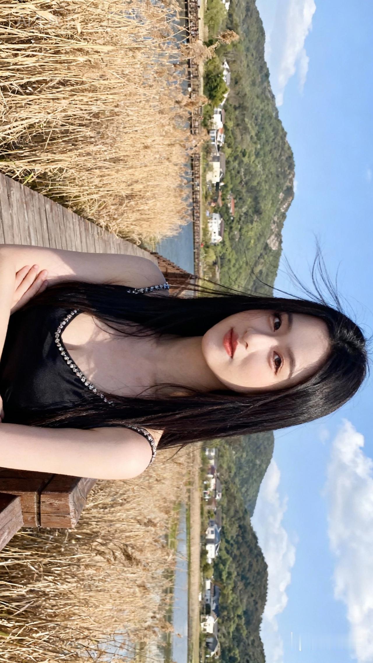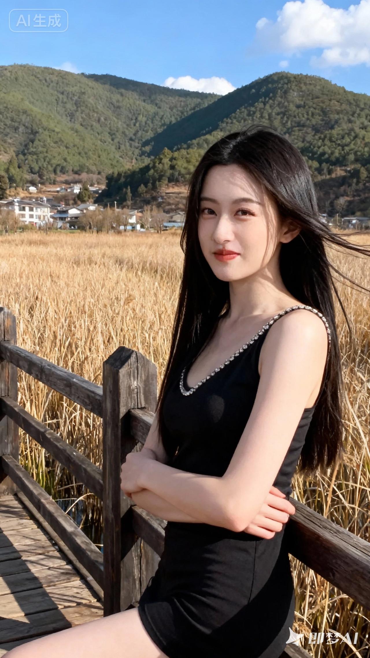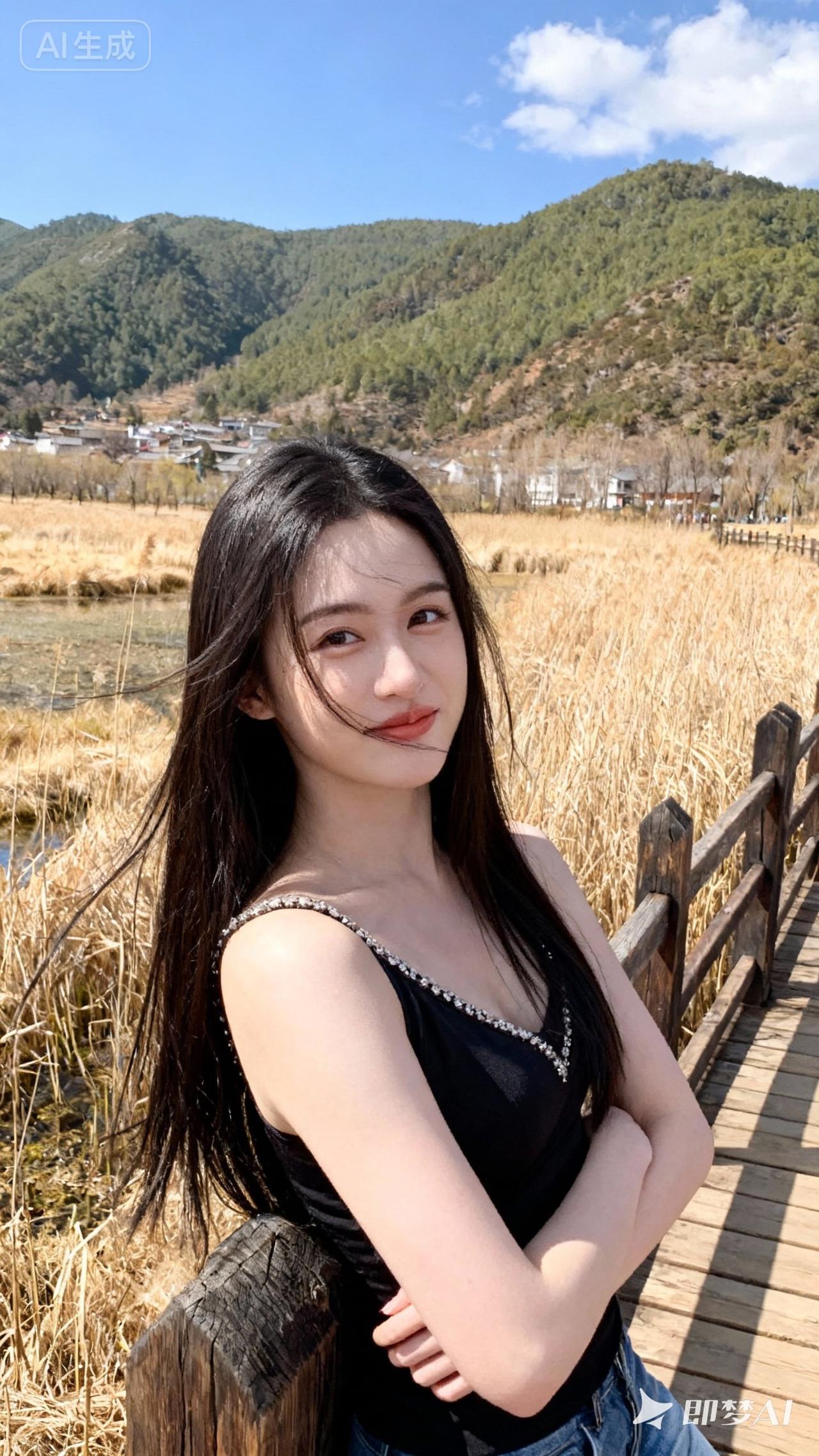 阳光下的甜美少女,黑发飘飘,笑容迷人,背景是青山绿水,美不胜收!🌞💖🌿