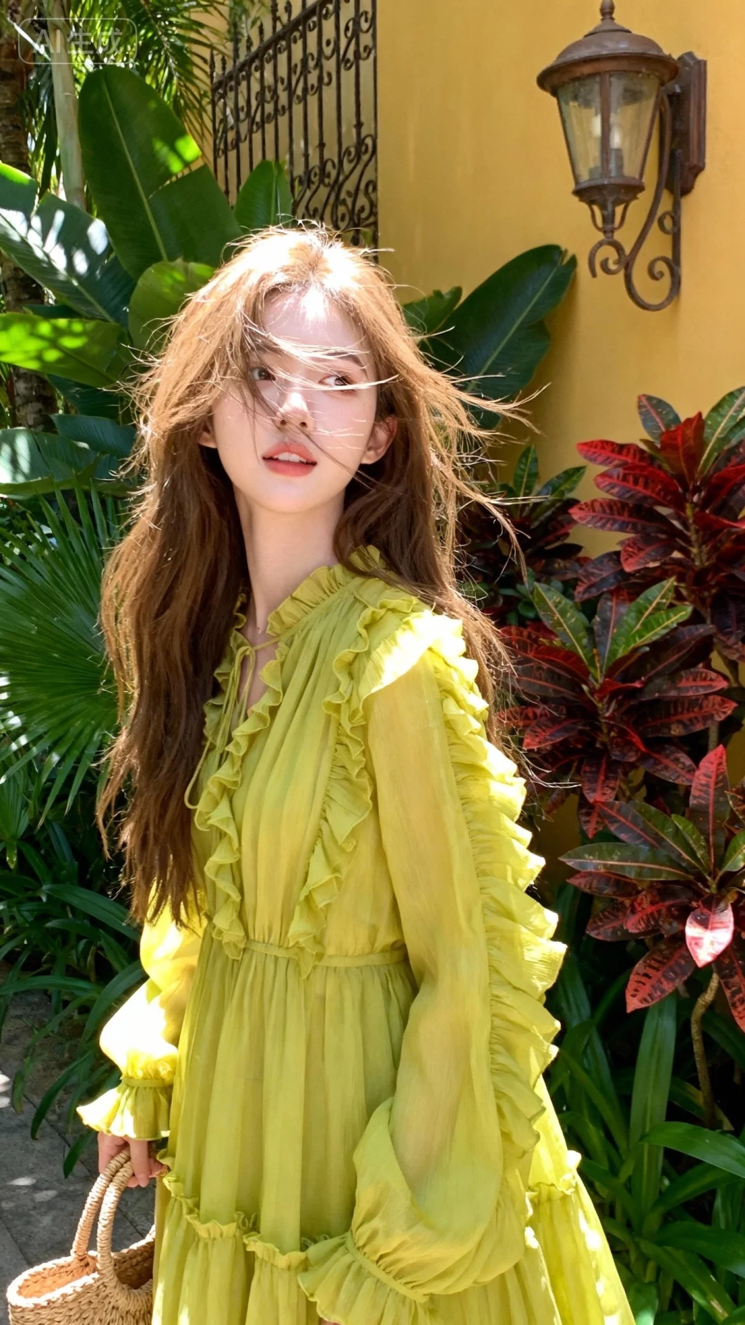 高清半身近照写真,唯美浪漫风格,头顶光,发丝光,侧光,商业修图,日常抓拍。 漂亮女生,19岁网红,浅棕慵懒长发及腰,自然披散着,发丝凌乱,风吹感,发丝拂面,冷白皮,身着亮黄色雪纺木耳边极繁杂工艺超唯美款仙女风长裙,手提编织草编包,在充满热带植物(阔叶绿植、红边观叶植物)的户外场景中。背景是暖黄色墙面,搭配复古灯具与铁艺装饰,整体风格复古度假风,光线为明亮的阳光,形成斑驳的光影效果 近景,半身照,聚焦脸部