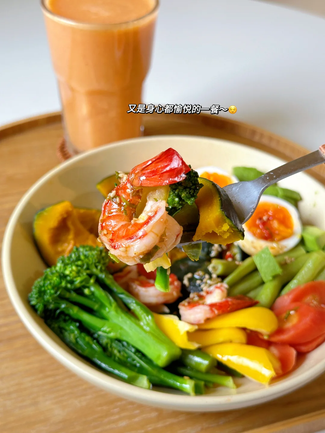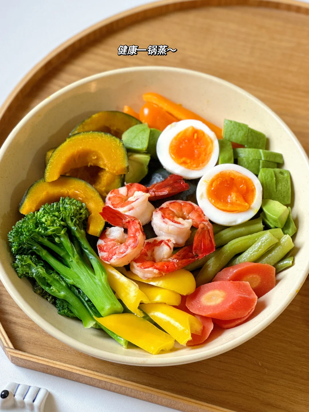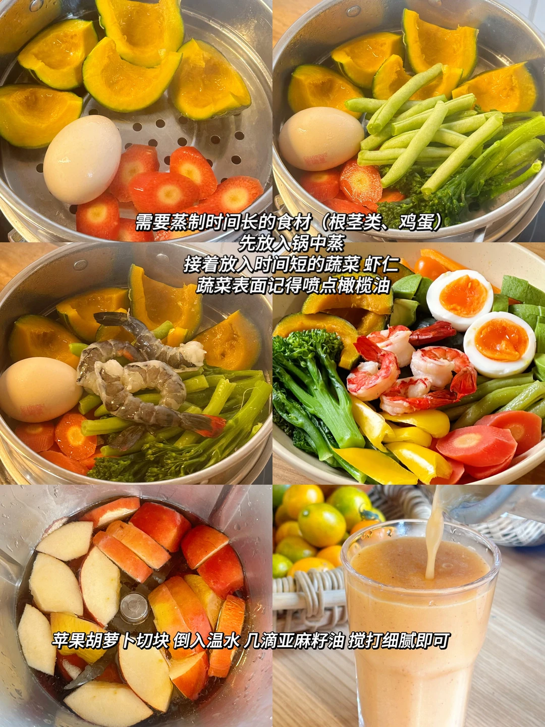 “食用各种完整的、新鲜的、干净的食物。 主要是蔬菜、水果、豆类、坚果、种子、谷物、芽苗菜和健康脂肪类食物。” 今日份健康早餐分享 ▪️虾仁鸡蛋杂蔬一锅蒸 ▪️苹果胡萝卜蔬果昔 👩🍳健康一锅蒸 超推荐的健康烹饪法 需要蒸制时间长的食材(根茎类、鸡蛋等) 先放入锅中蒸一下 接着放入时间短的蔬菜虾仁等 表面记得喷点橄榄油 最后调一个富含优质脂肪的美味油醋汁 就是心情美好 身体舒服的一餐~
