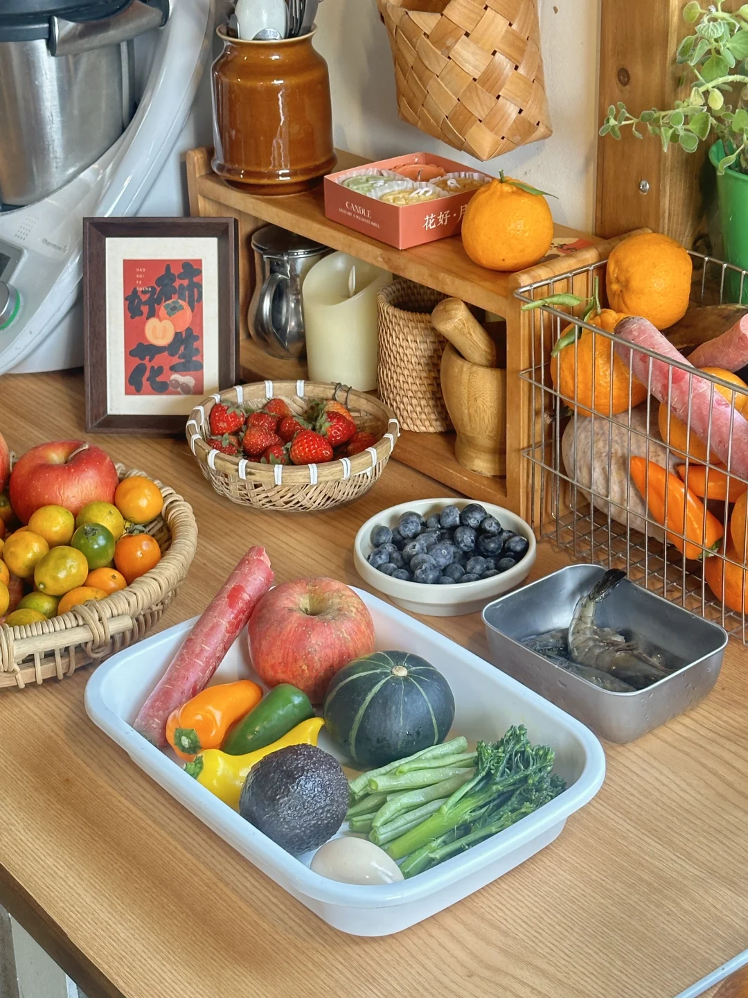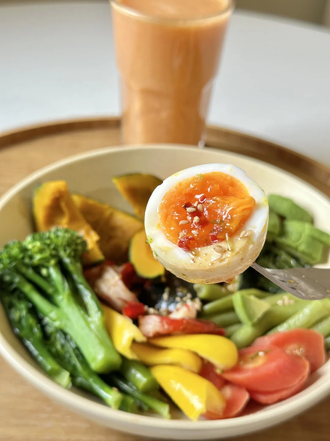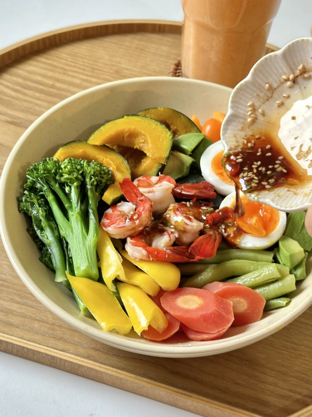 “食用各种完整的、新鲜的、干净的食物。 主要是蔬菜、水果、豆类、坚果、种子、谷物、芽苗菜和健康脂肪类食物。” 今日份健康早餐分享 ▪️虾仁鸡蛋杂蔬一锅蒸 ▪️苹果胡萝卜蔬果昔 👩🍳健康一锅蒸 超推荐的健康烹饪法 需要蒸制时间长的食材(根茎类、鸡蛋等) 先放入锅中蒸一下 接着放入时间短的蔬菜虾仁等 表面记得喷点橄榄油 最后调一个富含优质脂肪的美味油醋汁 就是心情美好 身体舒服的一餐~