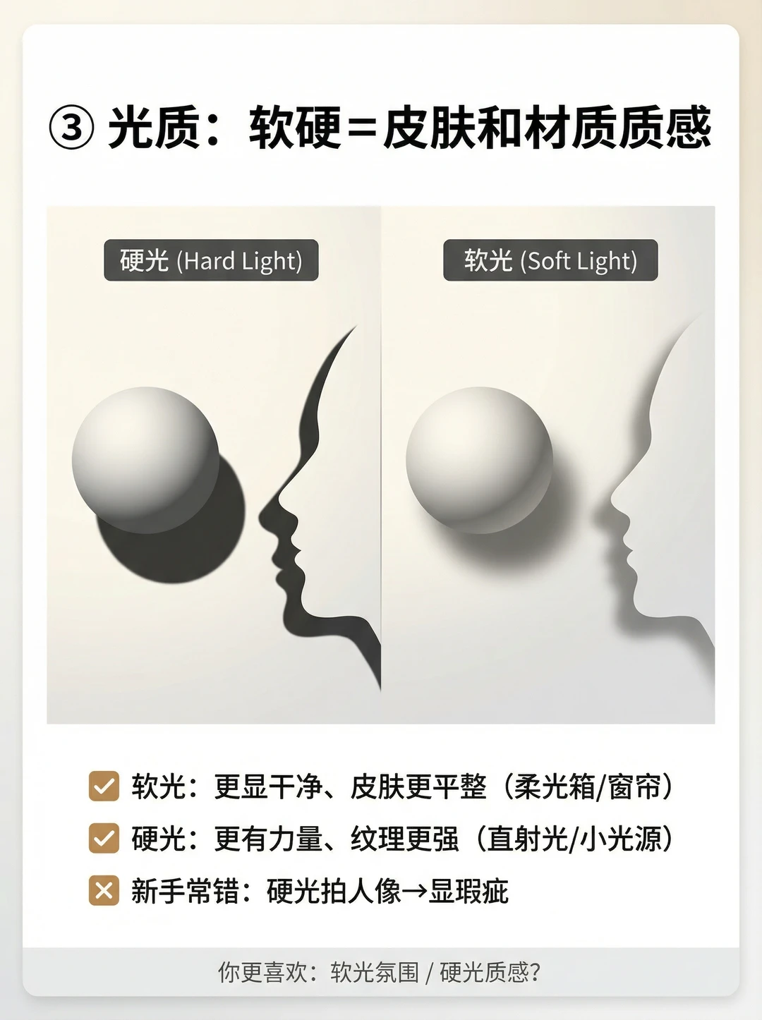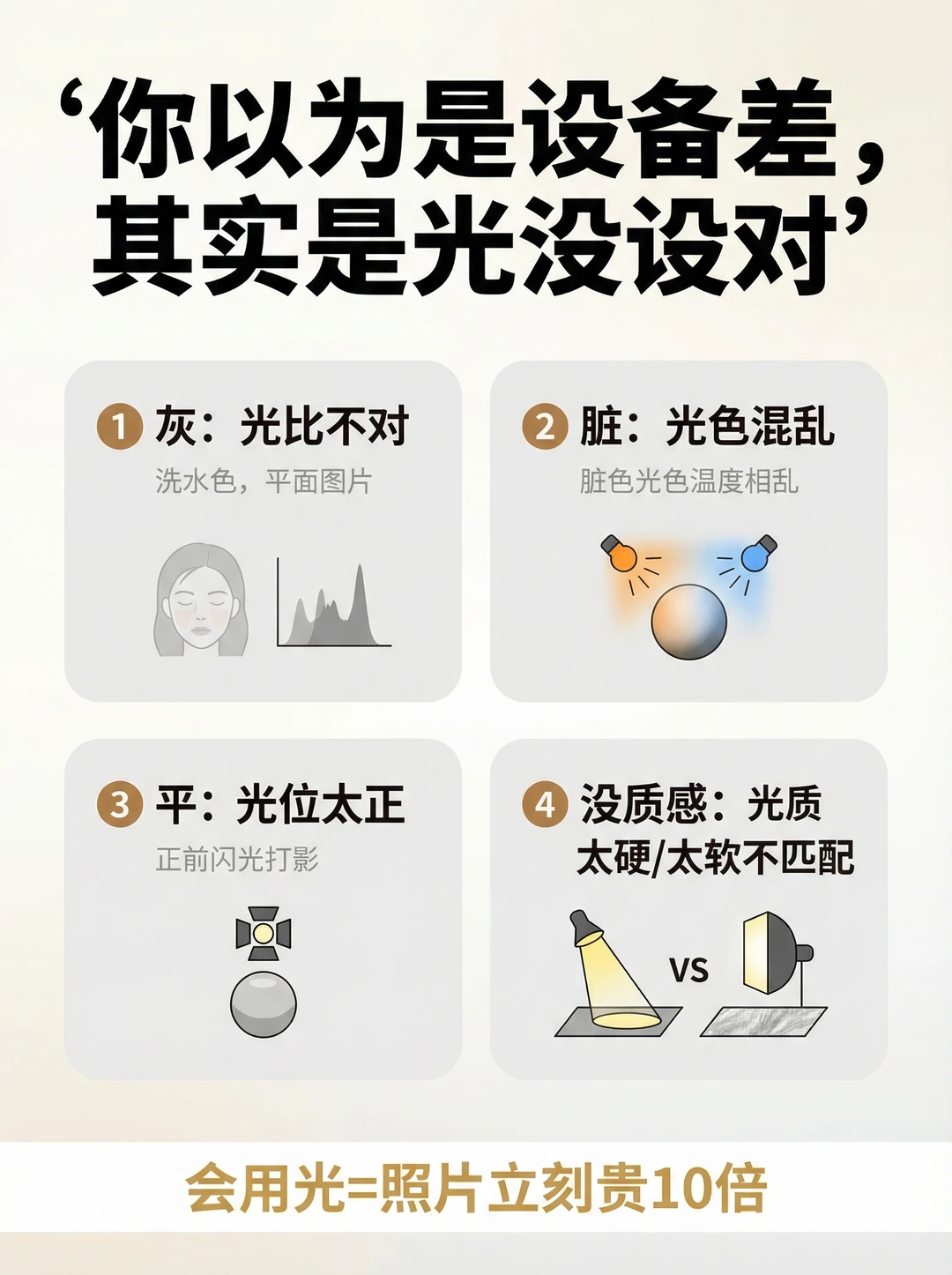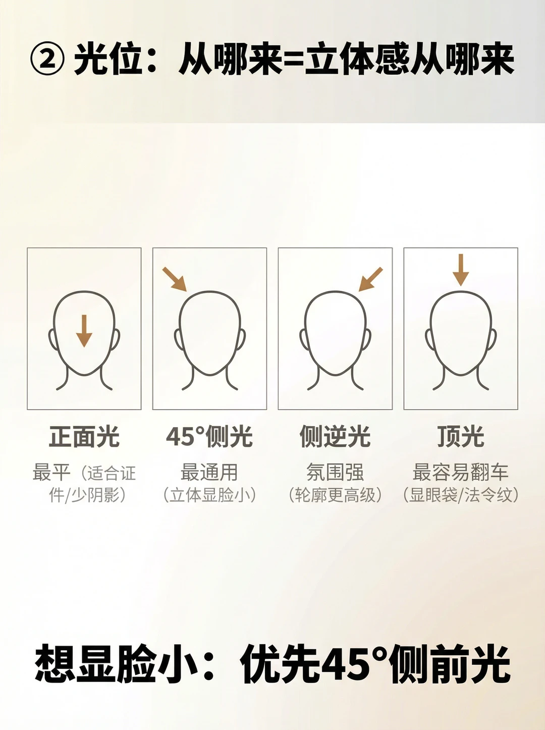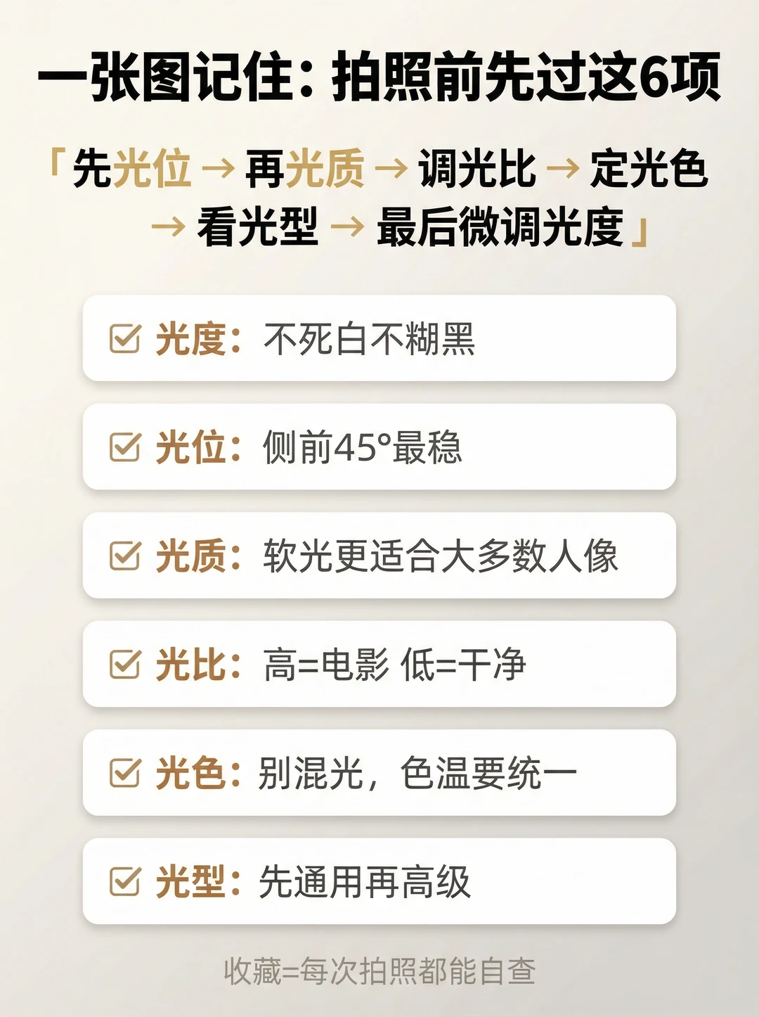 你照片总是灰、脏、平、没质感,别急着怪设备📷 很多时候问题只在:光没设对。我把“光的六要素”做成一张收藏级自查表👇 ✅ 光度:亮不亮(曝光别死白/糊黑) ✅ 光位:从哪来(想显立体→优先45°侧前光) ✅ 光质:软硬(软光更干净,硬光更有纹理) ✅ 光比:明暗差(低光比=清透耐看,高光比=电影高级) ✅ 光色:冷暖(最怕混光!色温统一才干净) ✅ 光型:脸上光影长什么样(环形光通用、伦勃朗更高级) 📌可截图顺序:先光位→再光质→调光比→定光色→看光型→微调光度✨