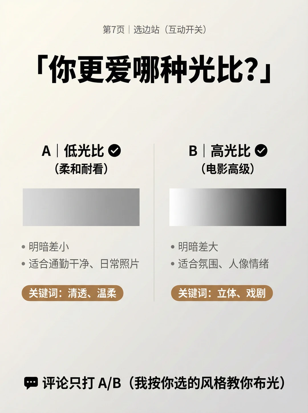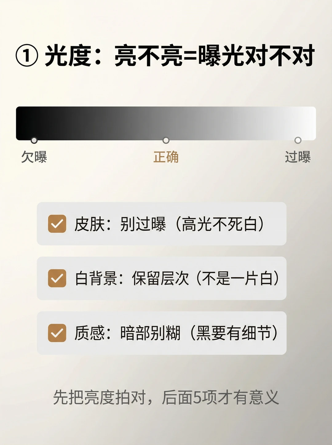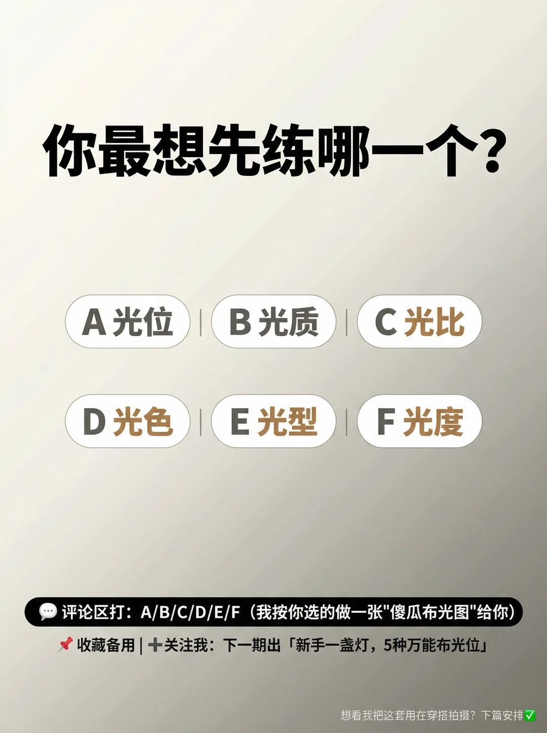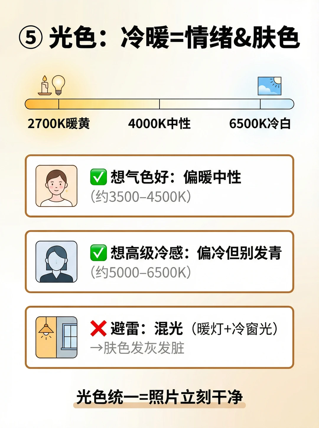 你照片总是灰、脏、平、没质感,别急着怪设备📷 很多时候问题只在:光没设对。我把“光的六要素”做成一张收藏级自查表👇 ✅ 光度:亮不亮(曝光别死白/糊黑) ✅ 光位:从哪来(想显立体→优先45°侧前光) ✅ 光质:软硬(软光更干净,硬光更有纹理) ✅ 光比:明暗差(低光比=清透耐看,高光比=电影高级) ✅ 光色:冷暖(最怕混光!色温统一才干净) ✅ 光型:脸上光影长什么样(环形光通用、伦勃朗更高级) 📌可截图顺序:先光位→再光质→调光比→定光色→看光型→微调光度✨