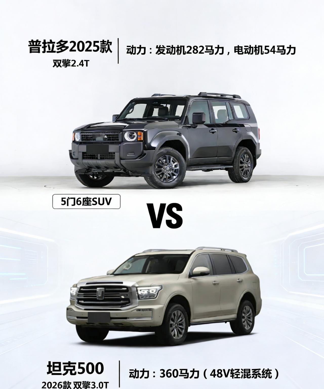 硬刚日系硬派,普拉多与坦克500之争国产硬派新贵正面“硬刚”日系传奇,近20万差价怎么选? 1. 动力与能耗 · 普拉多:2.4T油电混动,可靠为先,无法充电。 · 坦克500:2.0T插电混动,性能强悍,可纯电行驶(201km续航),日常成本低。 2. 越野与通过 · 普拉多:机械硬核。全时四驱配双托森差速器,强调长途穿越的稳定与从容。 · 坦克500:电控迅捷。三把锁+电机直驱,轮间限滑与脱困响应速度有优势。 3. 豪华与智能 · 普拉多:实用可靠。配置以满足越野和基础舒适为主,风格硬朗。 · 坦克500:科技满配。Nappa真皮、前后排座椅按摩、激光雷达高阶智驾,豪华与智能装备全面领先,科技感更丰富! 要长途穿越的可靠伙伴,两者都很优秀!