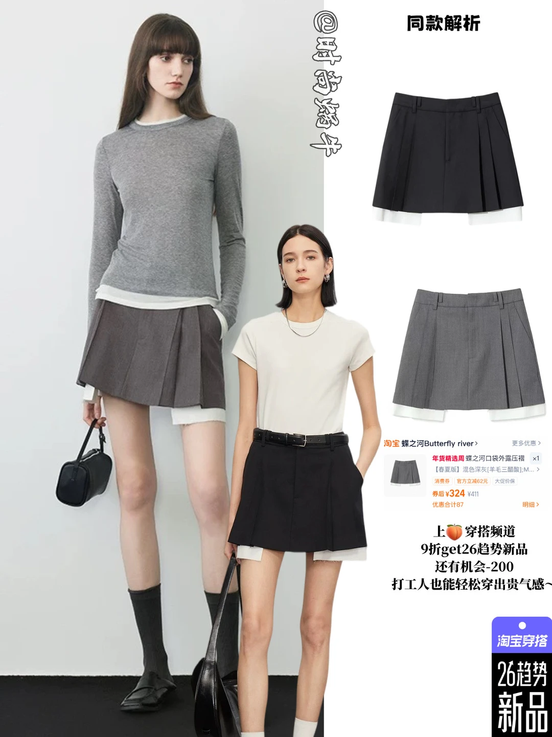 • 蝶之河的压褶半裙:假两件设计显腿长,通勤约会都适配