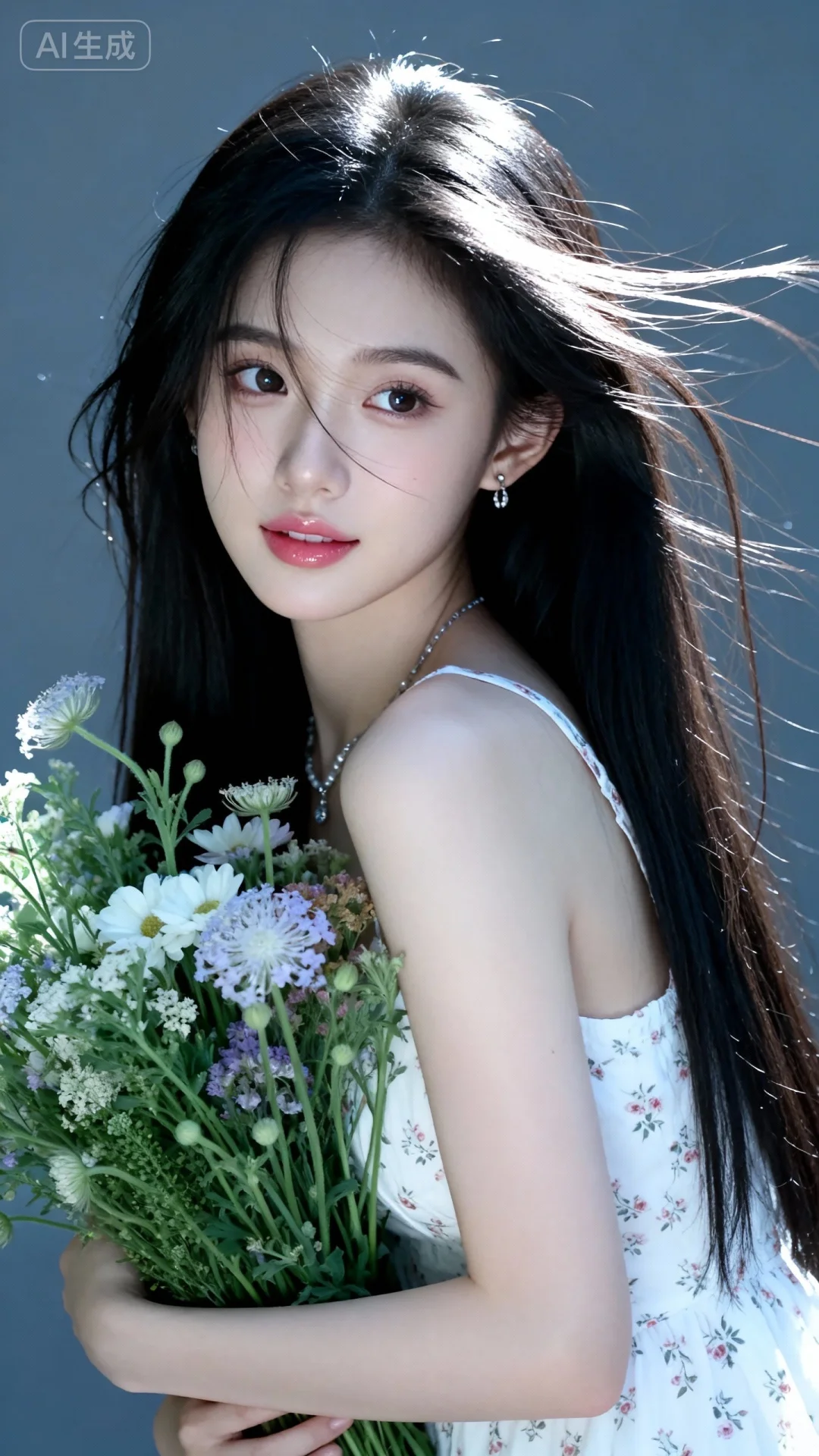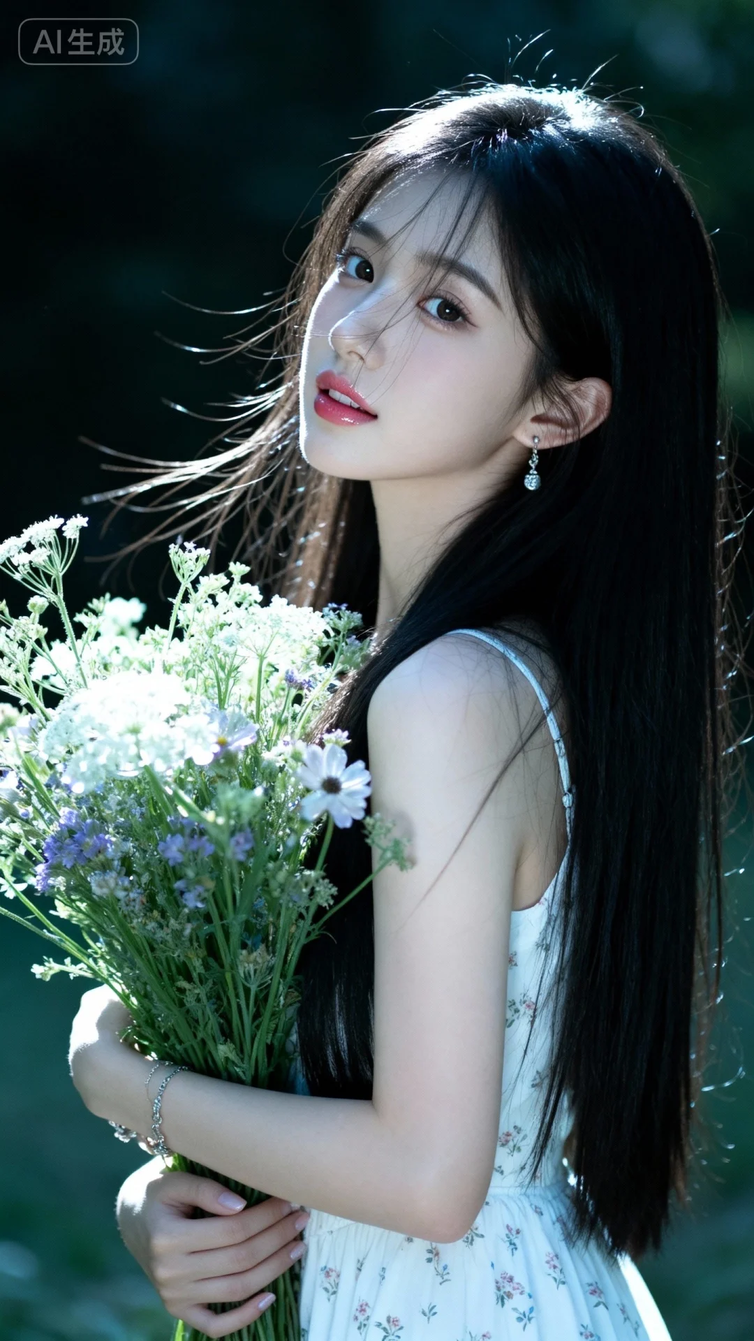 风格甜美少女系,氛围慵懒俏皮,东方美女,黑长直,年轻娇小,发丝呈现出自然的蓬松感与垂坠感,长发散落于肩头两侧,几缕发丝拂面,冷白皮气质美女,薇薇纯欲风,皮肤白皙,偶像气质,fairskin,气质的江南美女子,有点甜美,皮肤美白透亮,表情可爱,甜美氛围,细腻笔触,独特韵味的美,可爱表情一位美丽少女穿着白色碎花连衣裙,怀抱着一大束野花,花瓣在强烈阳光照射下变得透明,运用伦勃朗光线打光,营造出独特的光影效果,营造出唯美梦幻的氛围。