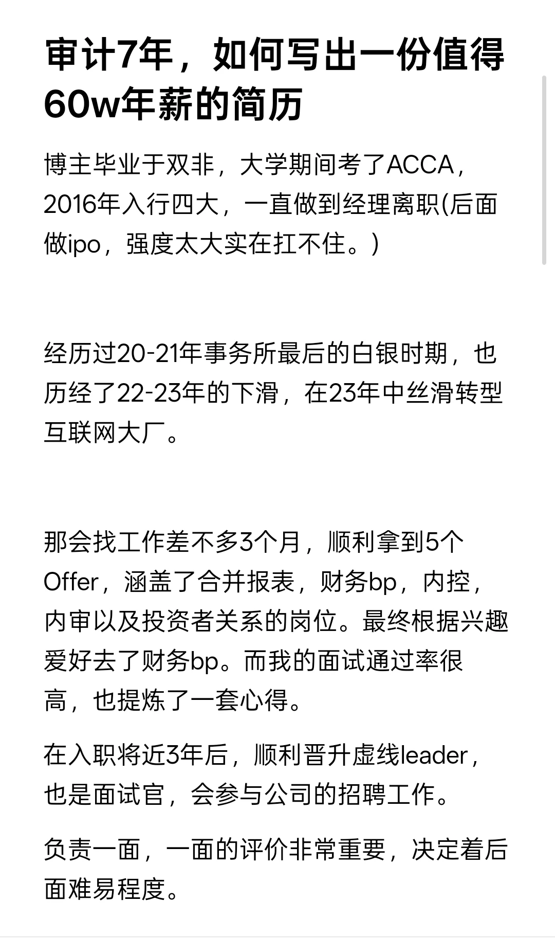 博主毕业于普通双非,大学期间考了ACCA,2016年入行四大,一直做到经理离职(后面做ipo,强度太大实在扛不住。)