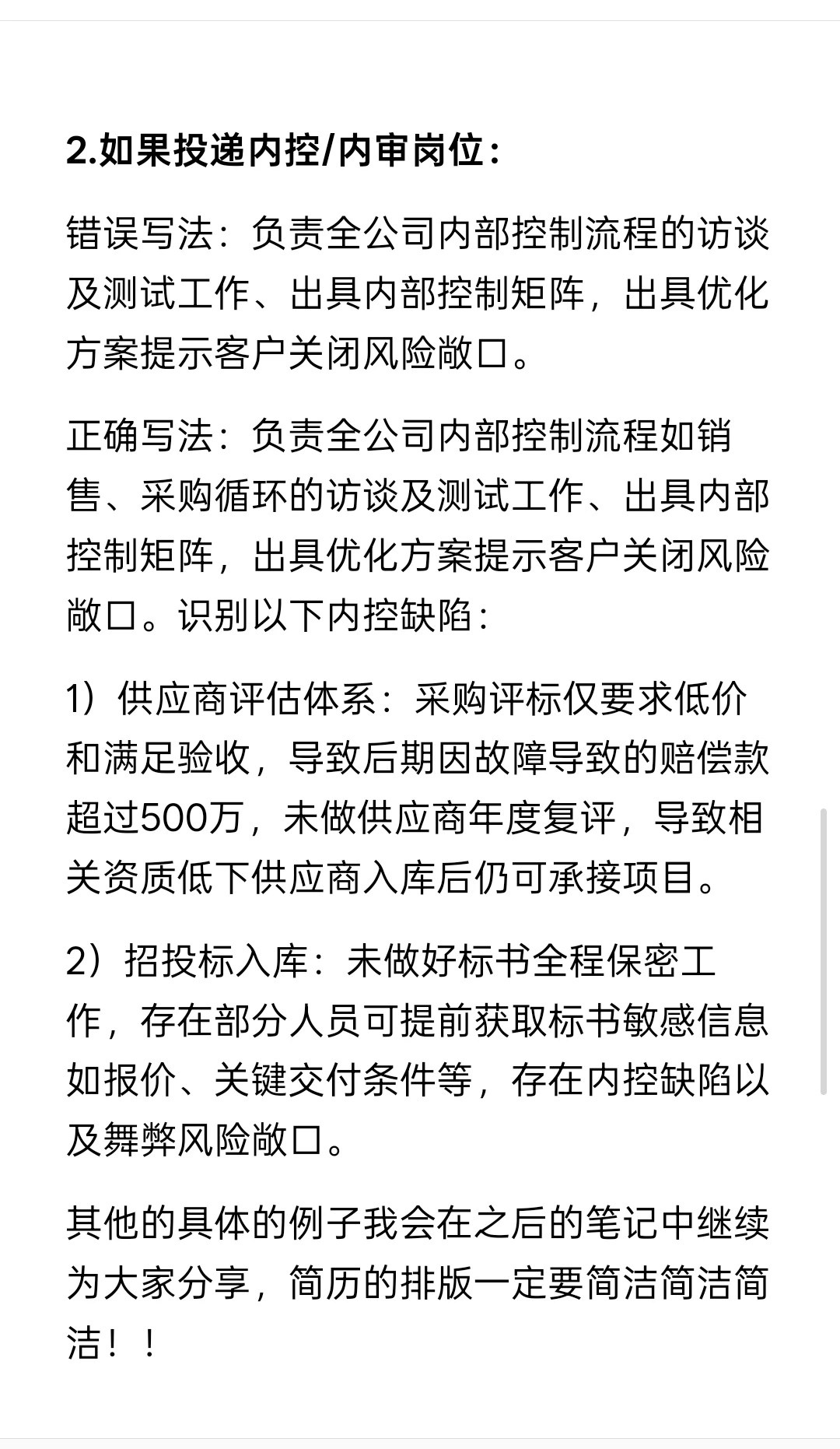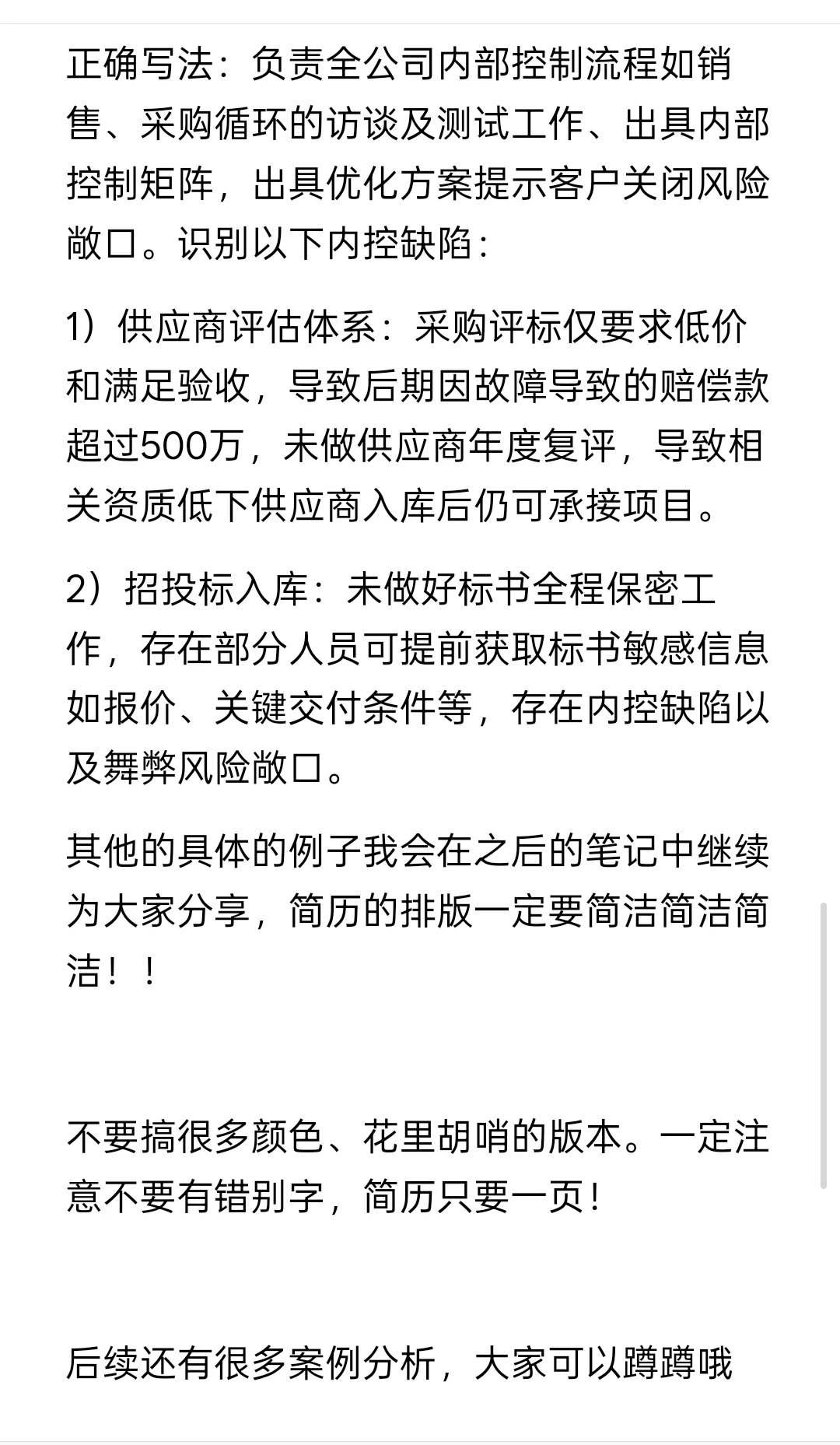 正确写法:负责全公司内部控制流程如销售、采购循环的访谈及测试工作、出具内部控制矩阵,出具优化方案提示客户关闭风险敞口。识别以下内控缺陷: