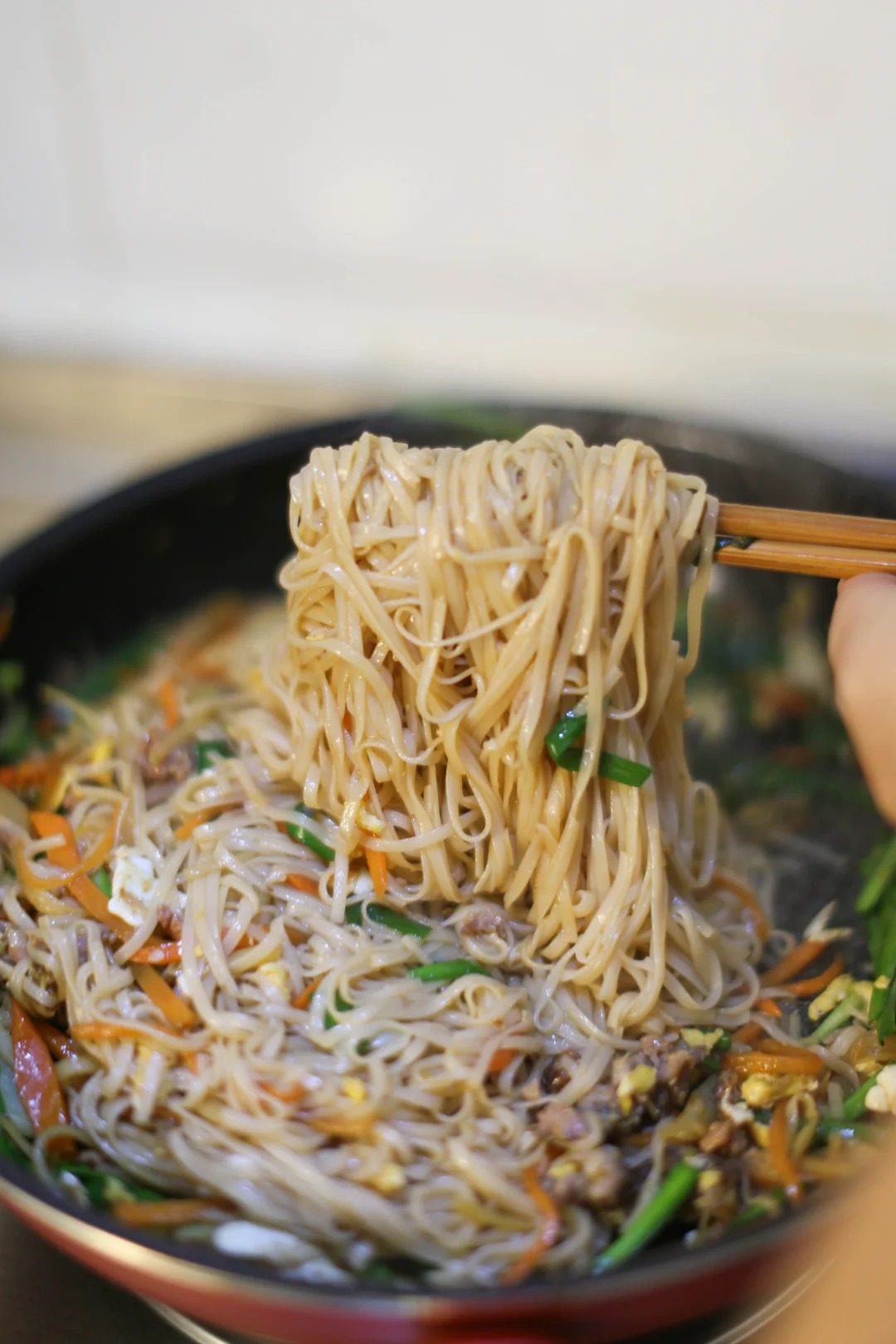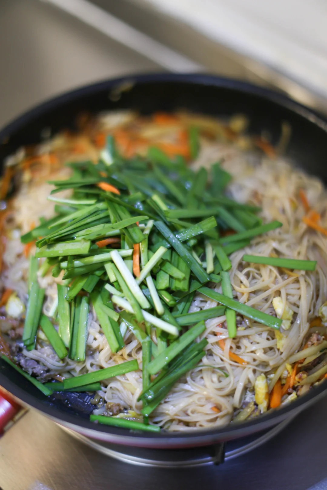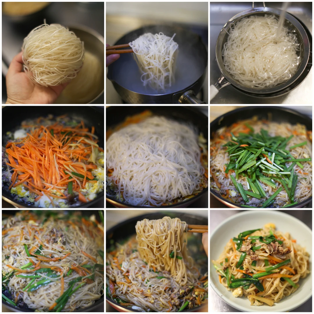 米粉用滚烫的热水泡软,大约3分钟。过凉水控干水分。(九宫格第一横排步骤) 各种喜欢的蔬菜提前备好。 鸡蛋 肉末煸炒碎,加入蔬菜炒软,放入泡好的米粉,老抽、生抽、食盐、味精 加入韭菜段,拌均匀,出锅加入几滴芝麻油即可。
