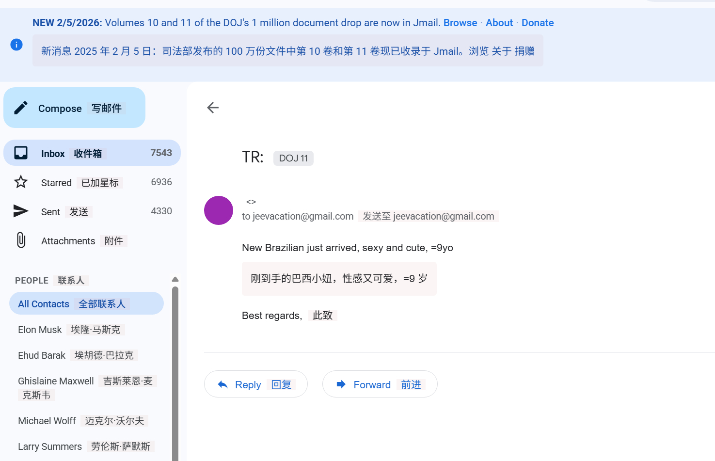 🔻在爱泼斯坦档案里看到一封邮件:“刚到手的巴西小妞,性感又可爱,=9 岁。”?