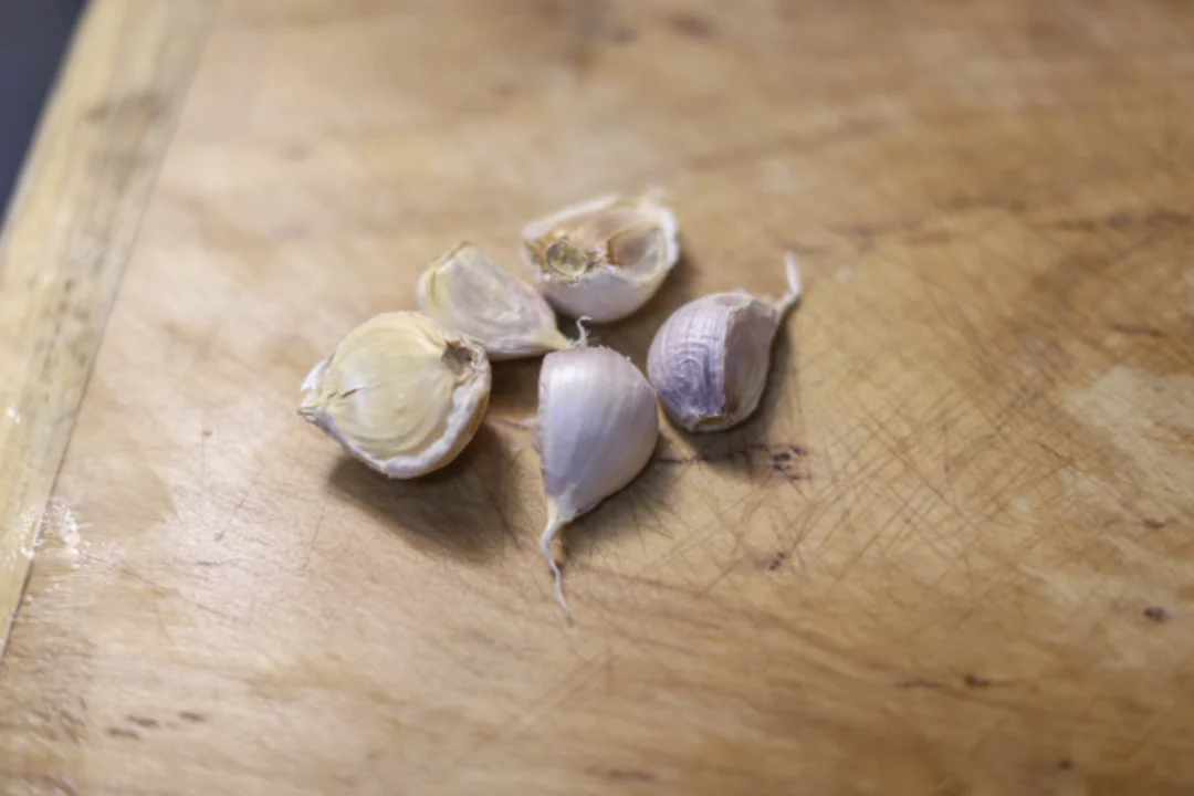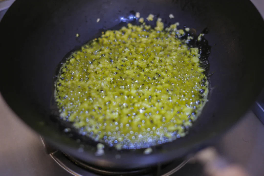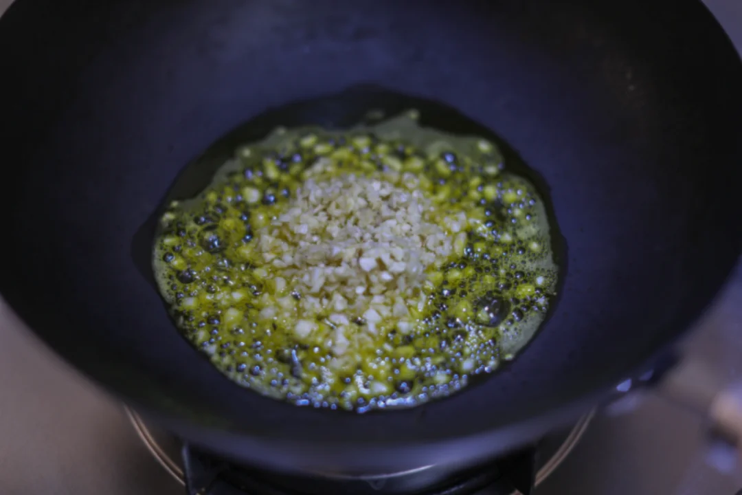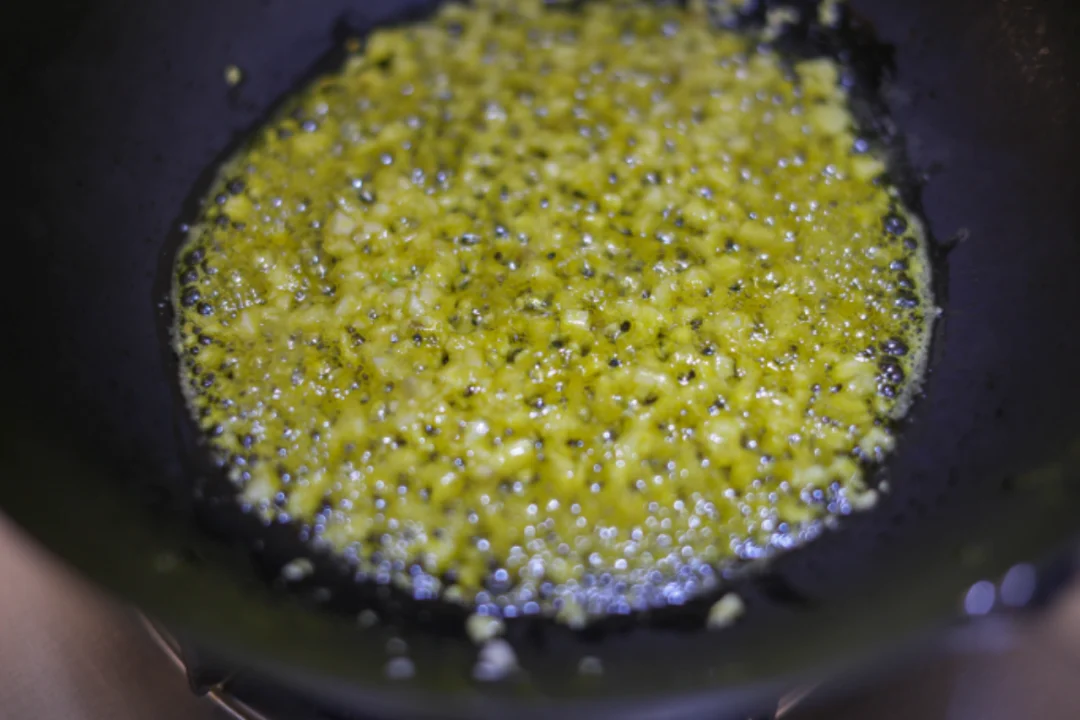 蒜瓣在案板上轻轻一拍,剥去外衣,剁成细蓉,放入有油的平底锅中煎至金黄,色泽格外诱人。