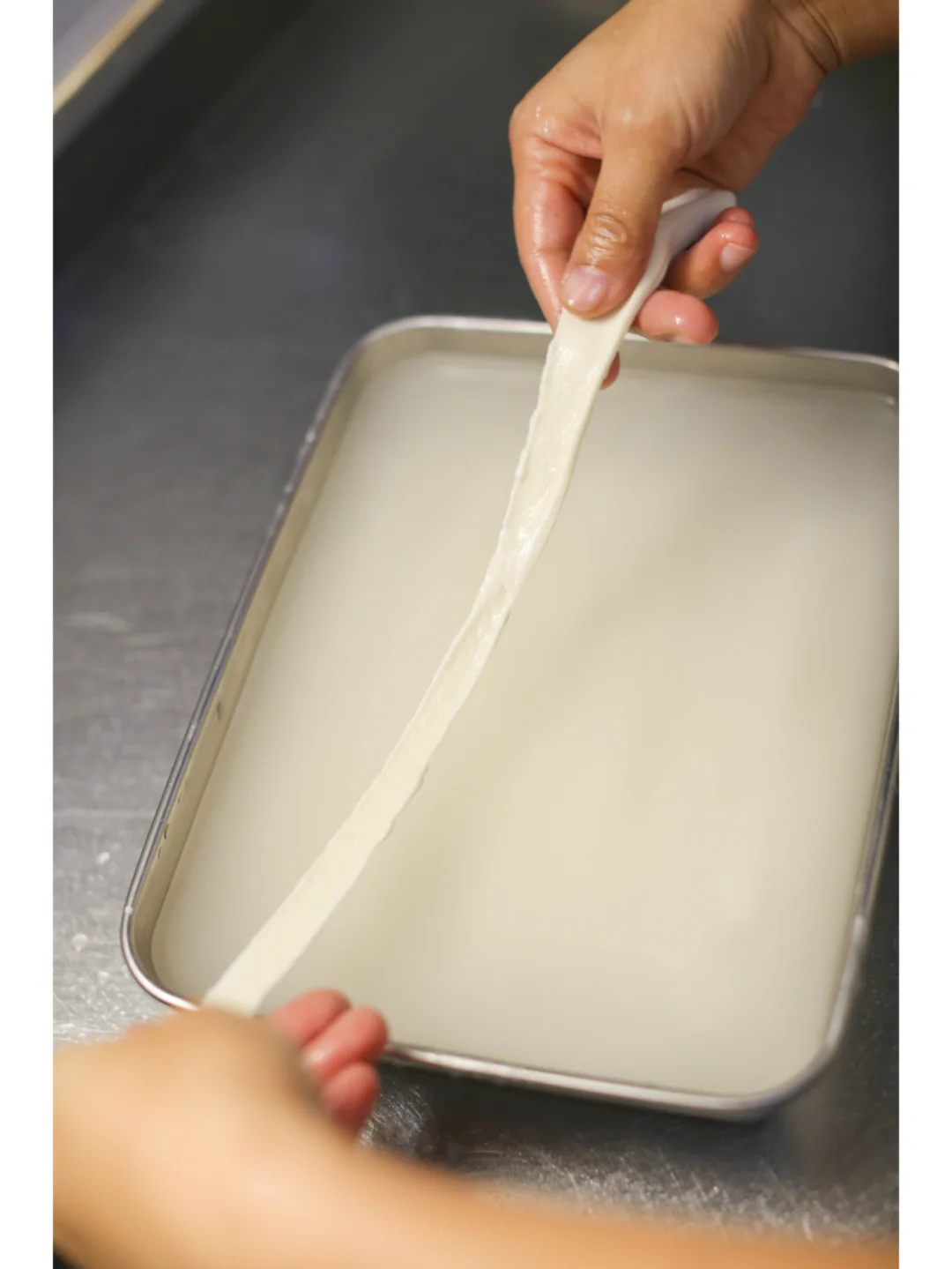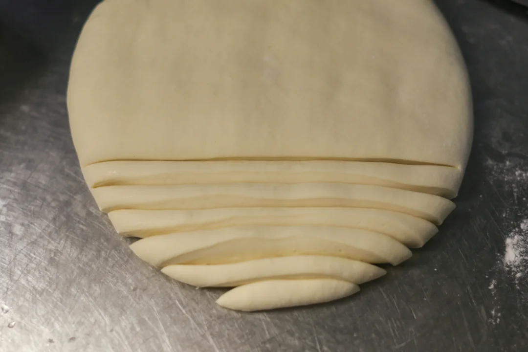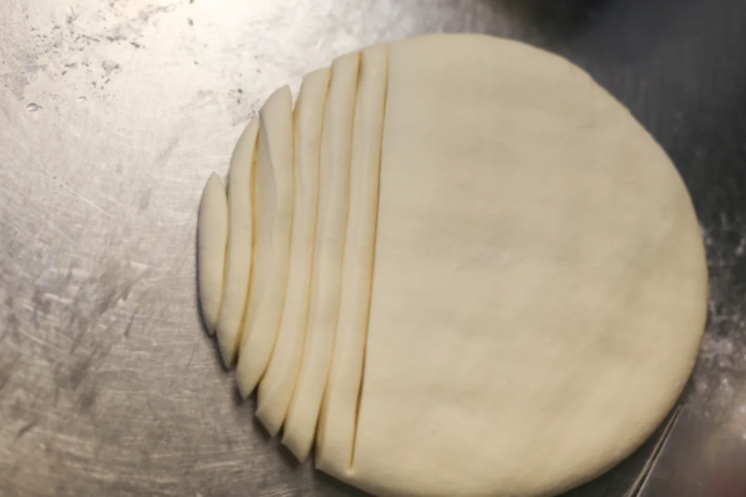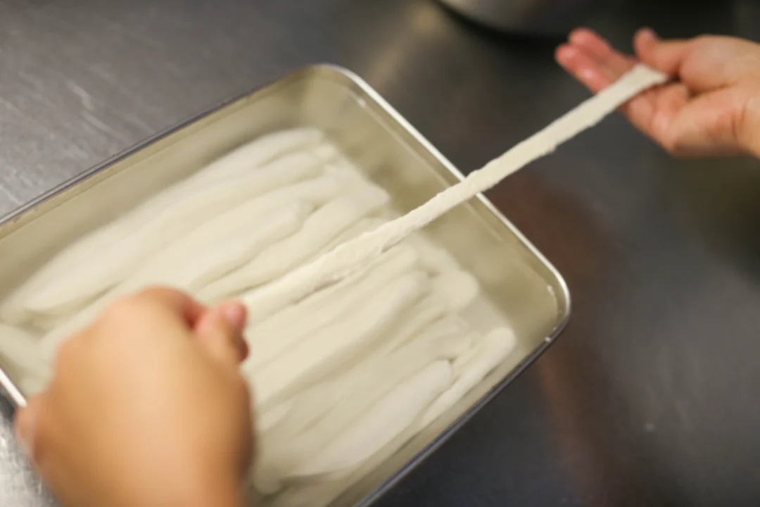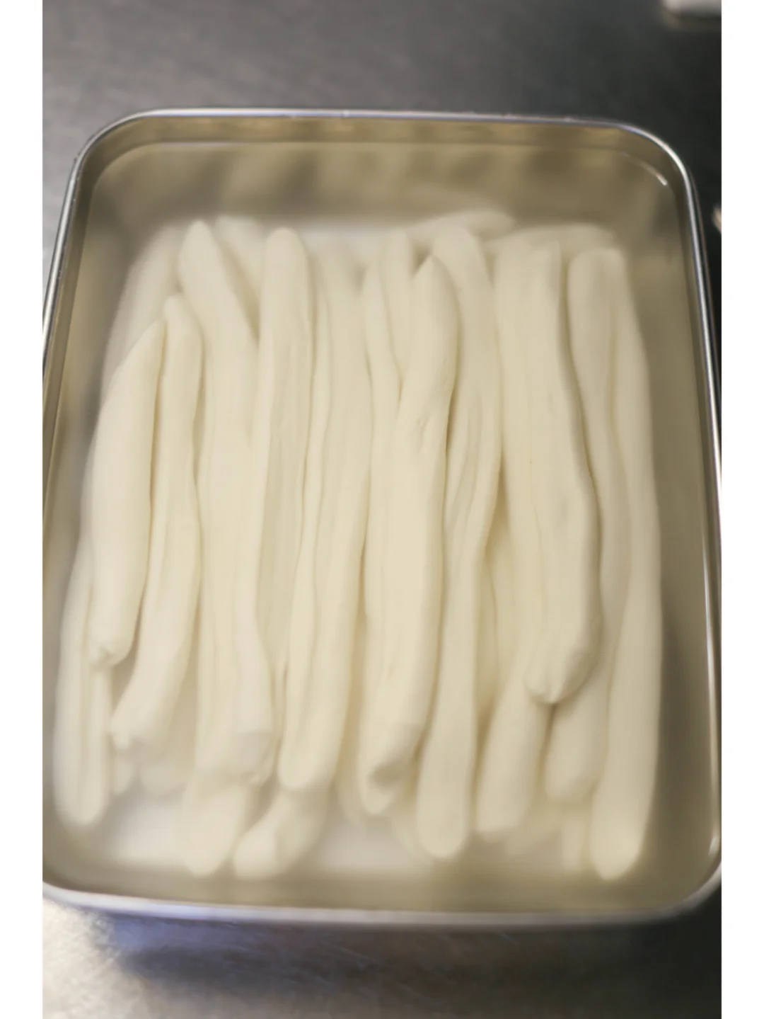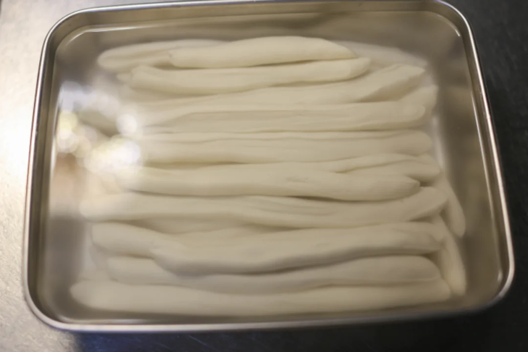 将醒好的面团压成一个圆,然后切割成长条,喜欢吃圆的就搓成圆的长条,喜欢吃宽的稍微搓长之后,压扁,放入冷水盆中即可,醒40分钟以上。