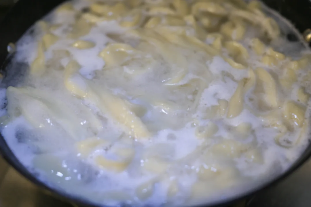 锅中烧水沸腾之后,开始水拉面,将面长条拉成圆长条或者扁长条即可。(拉的时候条不离水,水不离条),放入锅内煮熟即可。