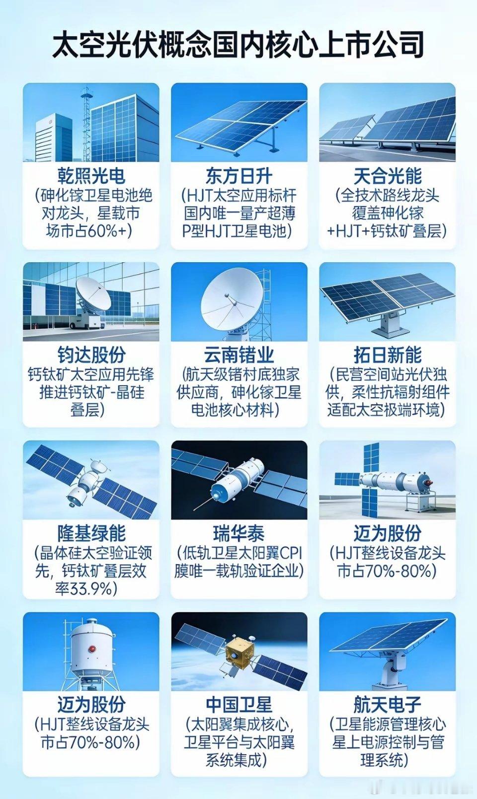 太空光伏产业链核心公司梳理。马斯克宣布布局太空光伏,太空能源商业化进程提速。国内已形成覆盖砷化镓、HJT、钙钛矿及柔性材料等路线的完整产业链。其中,乾照光电在星载砷化镓电池市场占有率超60%;东方日升、天合光能分别引领HJT太空应用与全技术路线整合;云南锗业供应航天级锗衬底材料;瑞华泰则完成低轨卫星太阳翼CPI膜的轨道验证。随着太空光伏技术逐步成熟,相关上市公司在卫星能源、空间站供电等领域已形成技术储备与先发优势,有望受益于太空能源基建需求的长期增长。太空光伏 砷化镓 HJT 钙钛矿 卫星能源