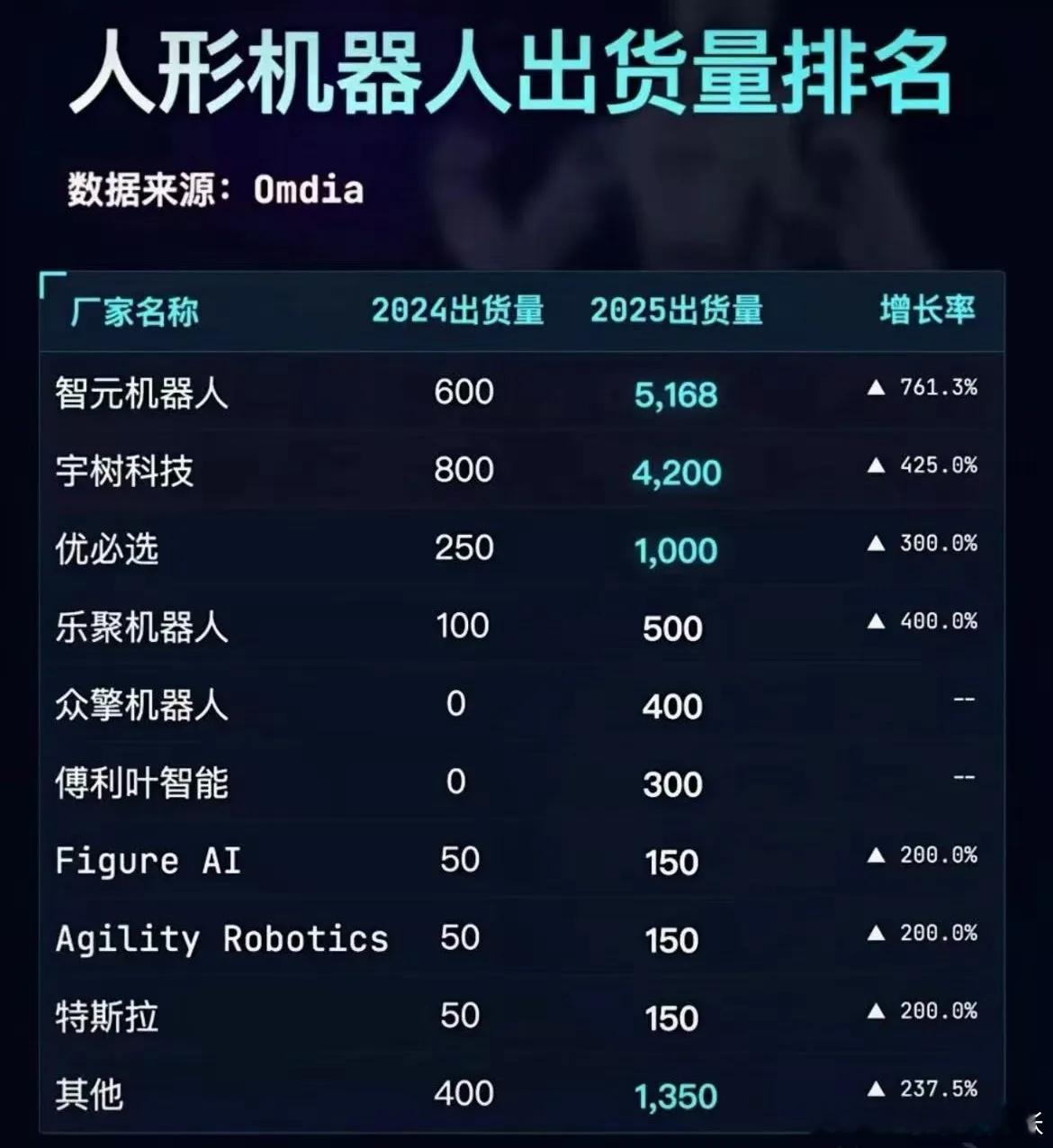 第三位优必选公司,出货量1000台,增幅300%。其中特斯拉2025年人形机器人出货量150台,相较去年出货量50台,增长200%。