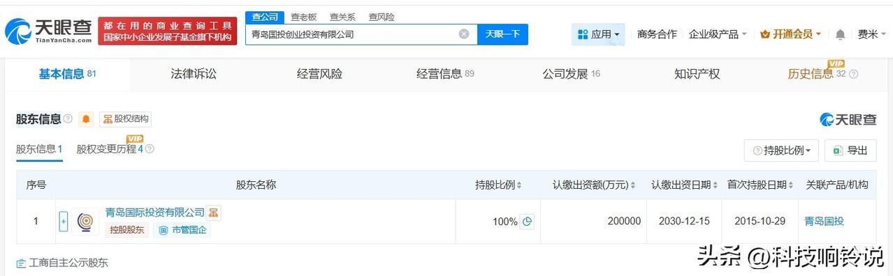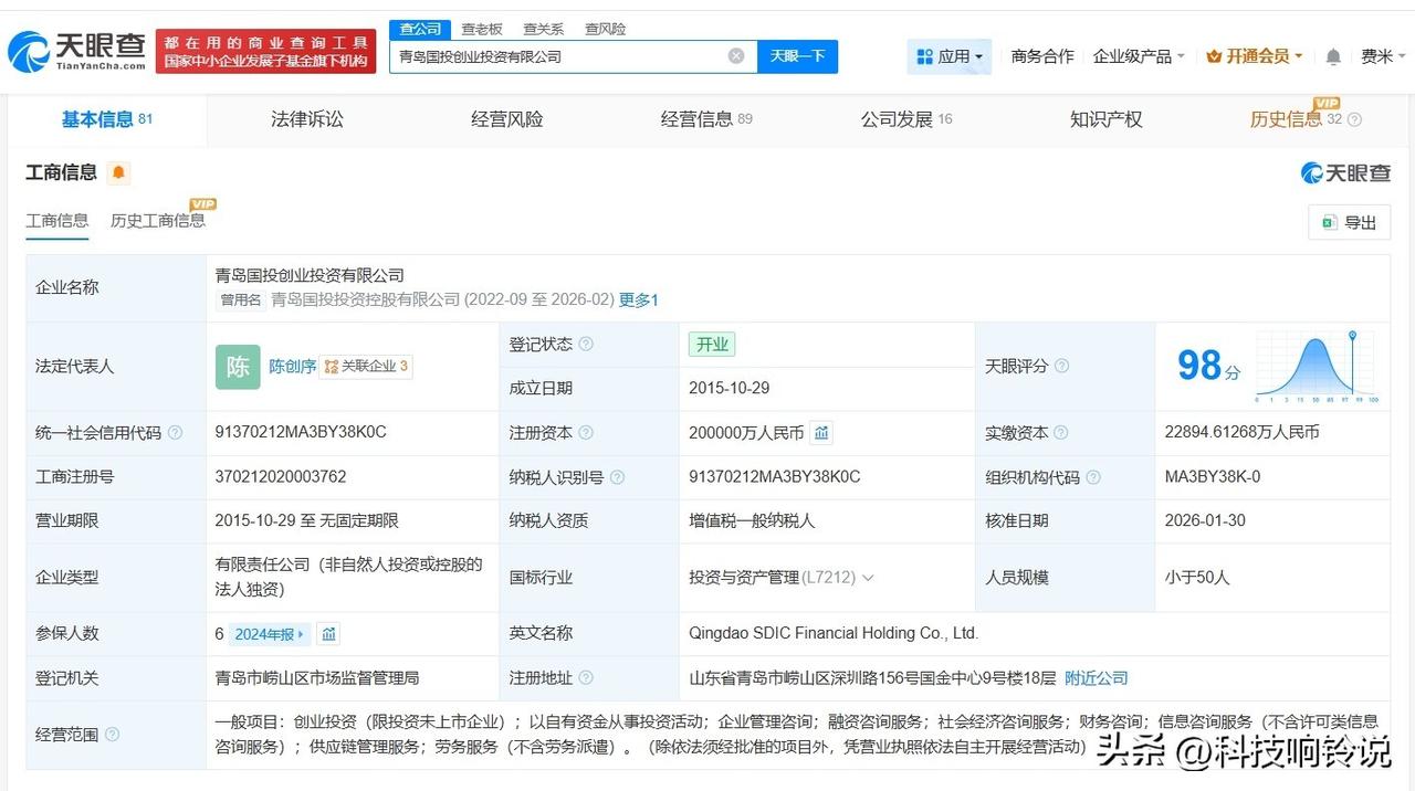 【青岛国投创业投资公司增资至20亿 青岛国投创业投资公司完成更名】 天眼查App显示,近日,青岛国投投资控股有限公司发生工商变更,企业名称变更为青岛国投创业投资有限公司,同时,注册资本由约2.29亿人民币增至20亿人民币,增幅约774%。 该公司成立于2015年10月,法定代表人为陈创序,经营范围包括创业投资、以自有资金从事投资活动、企业管理咨询、融资咨询服务等,由青岛国际投资有限公司全资持股。 天眼查信息: